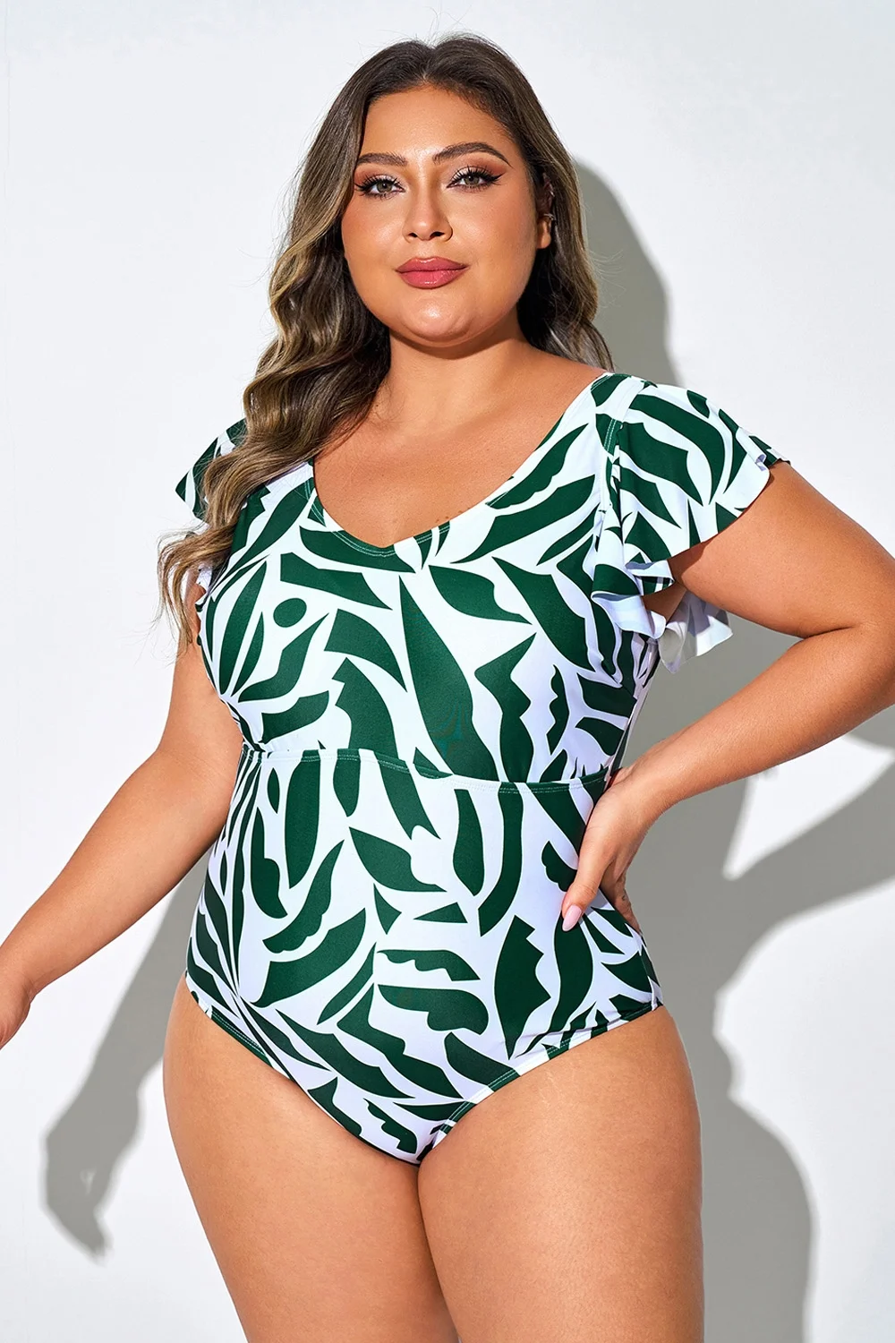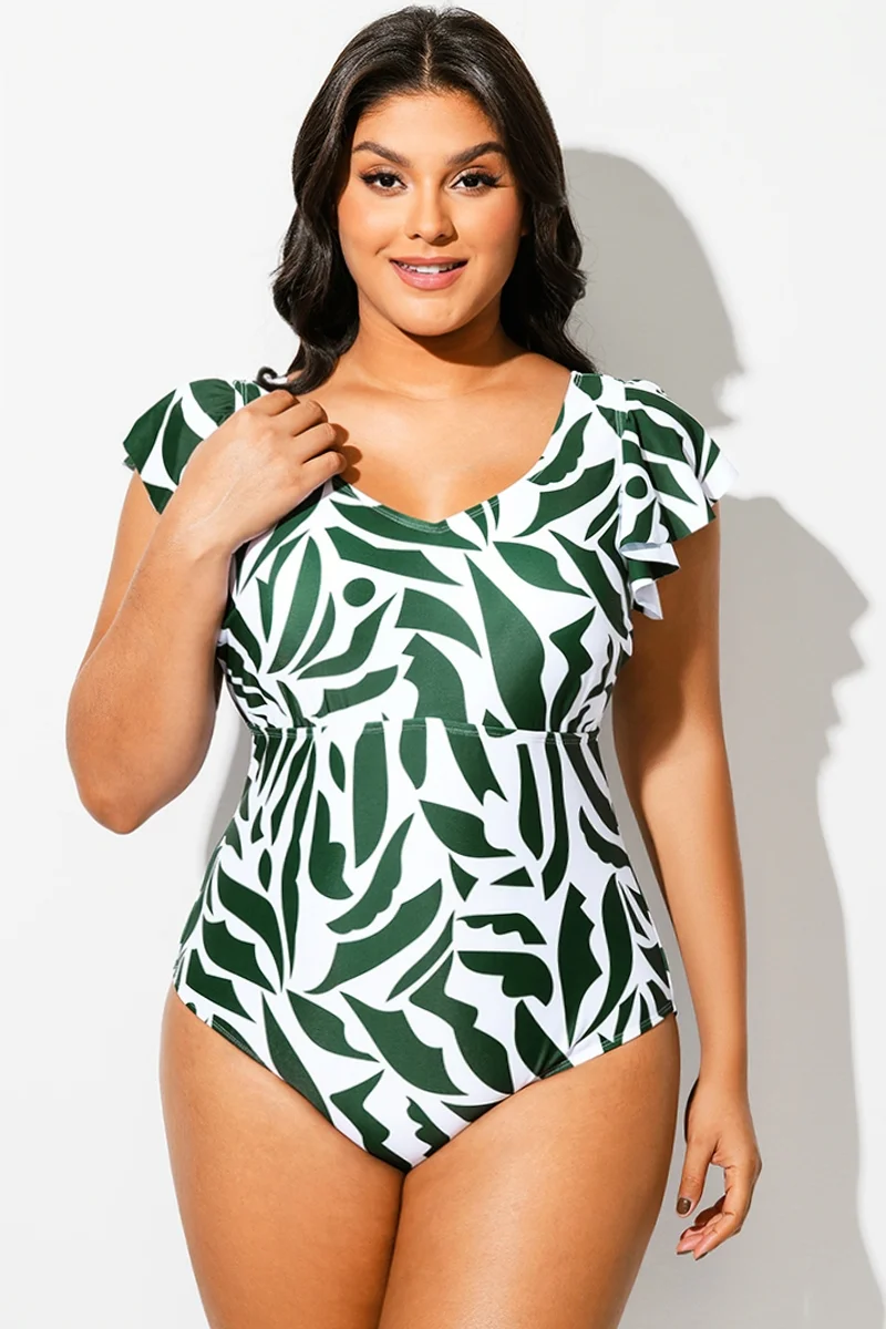 Plus Size Random Printed V-Neck One Piece Swimsuit - PremCurve