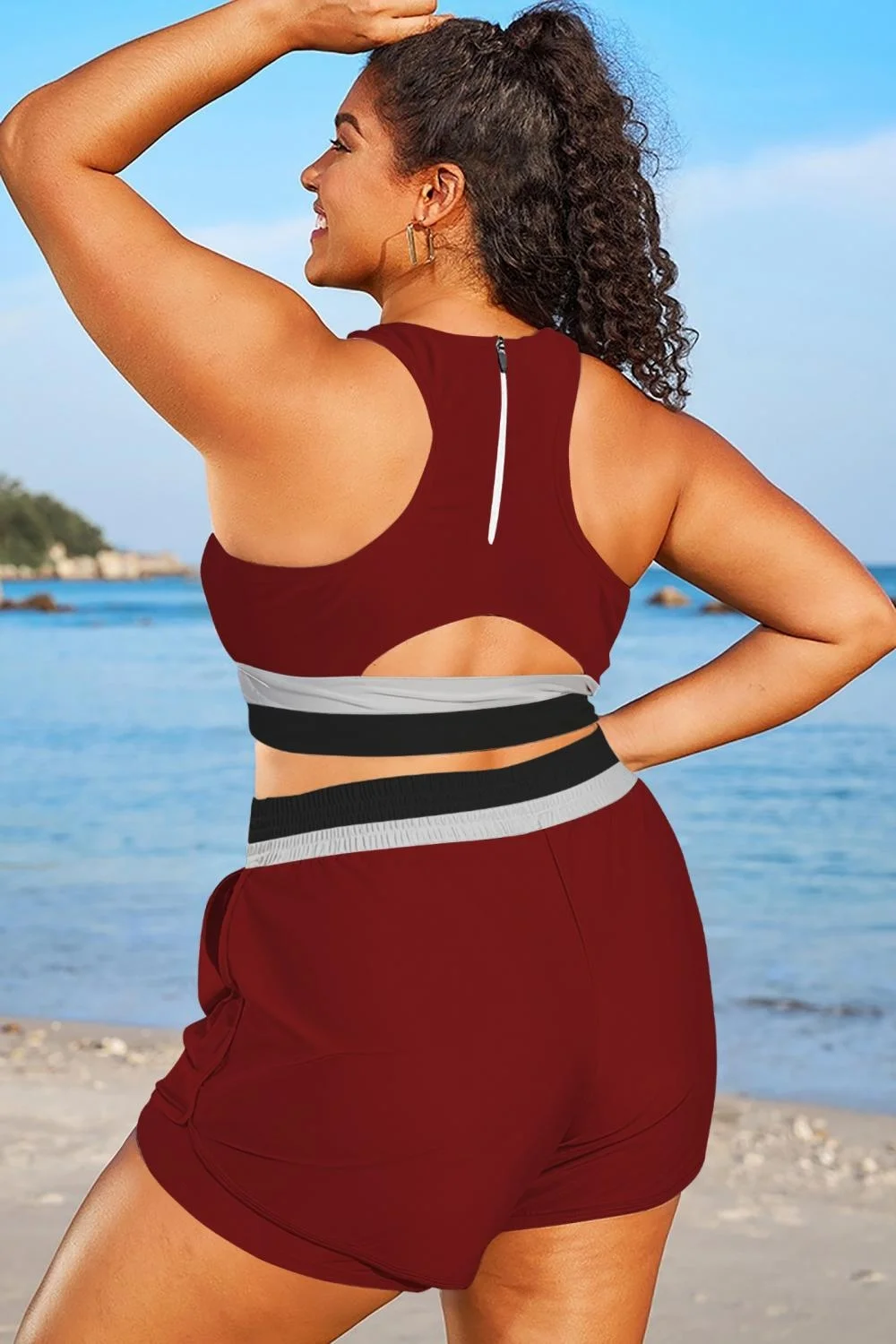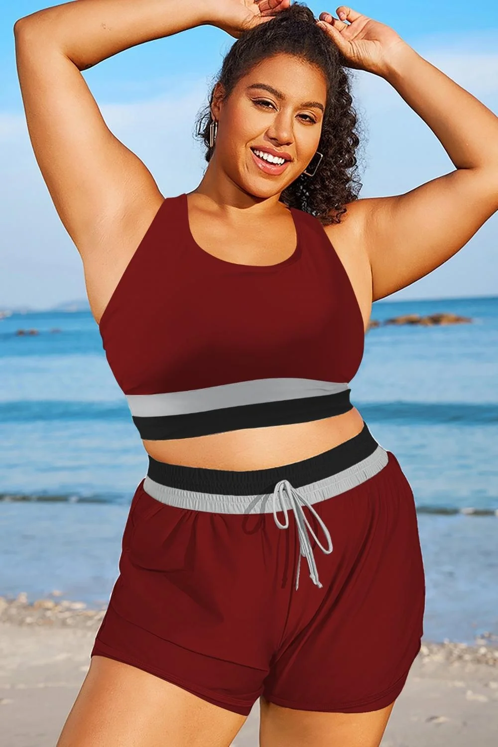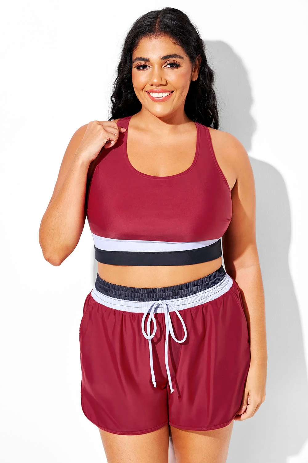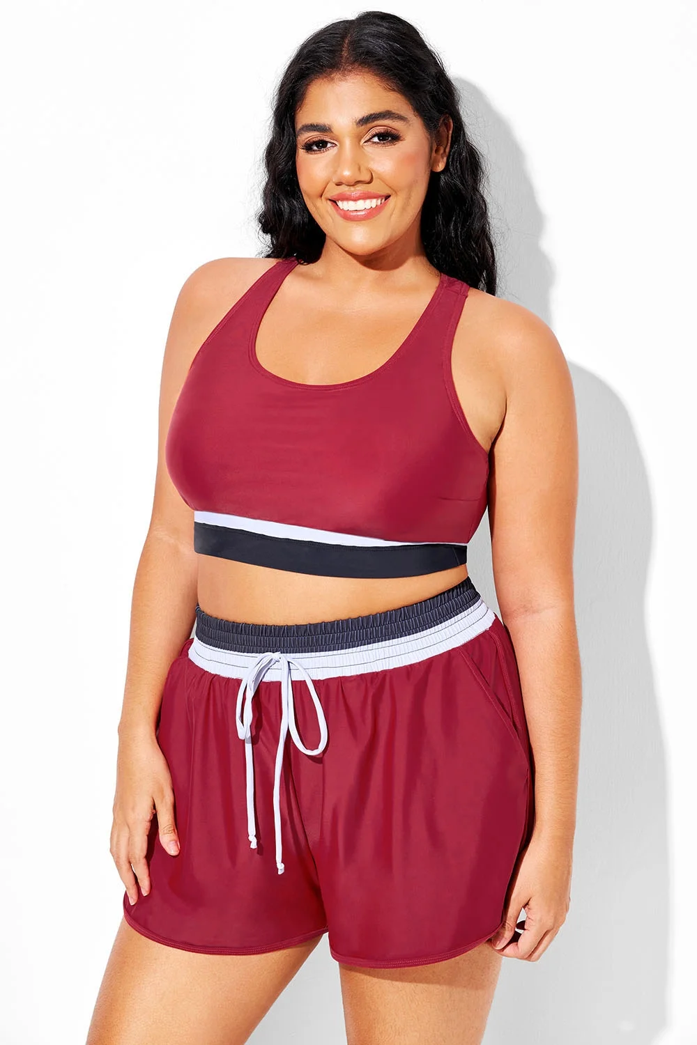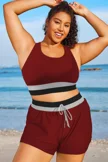 Plus Size Round Neck Dark Red Patchwork Bikini Top - PremCurve