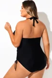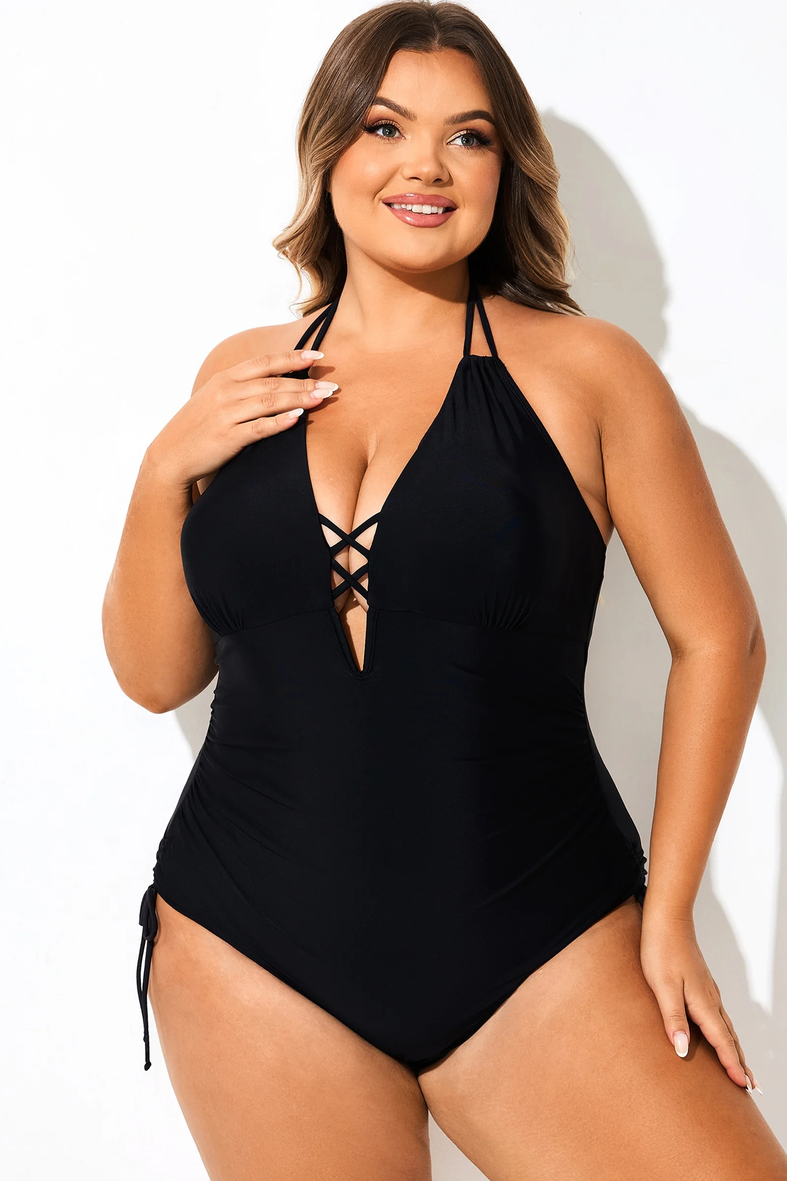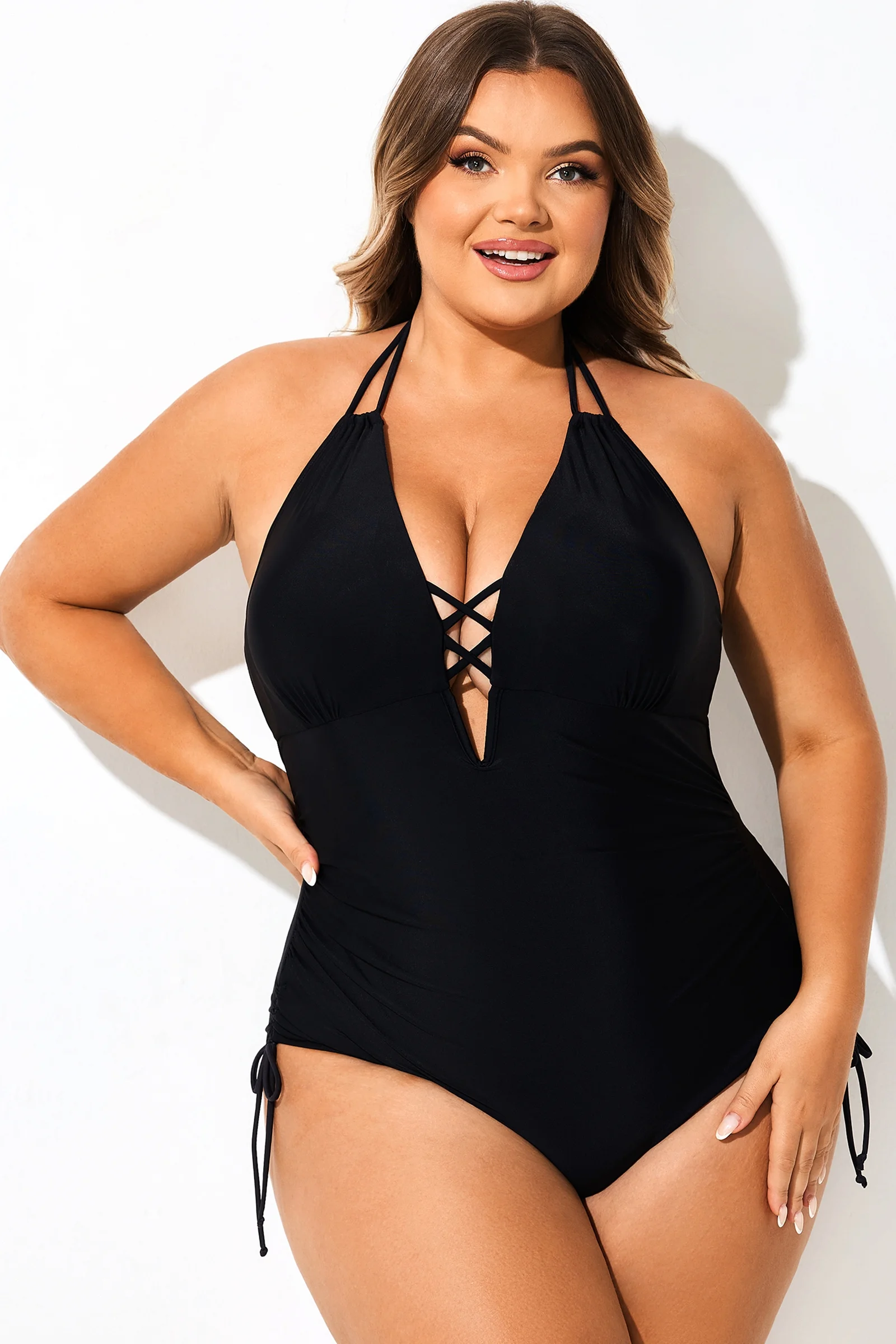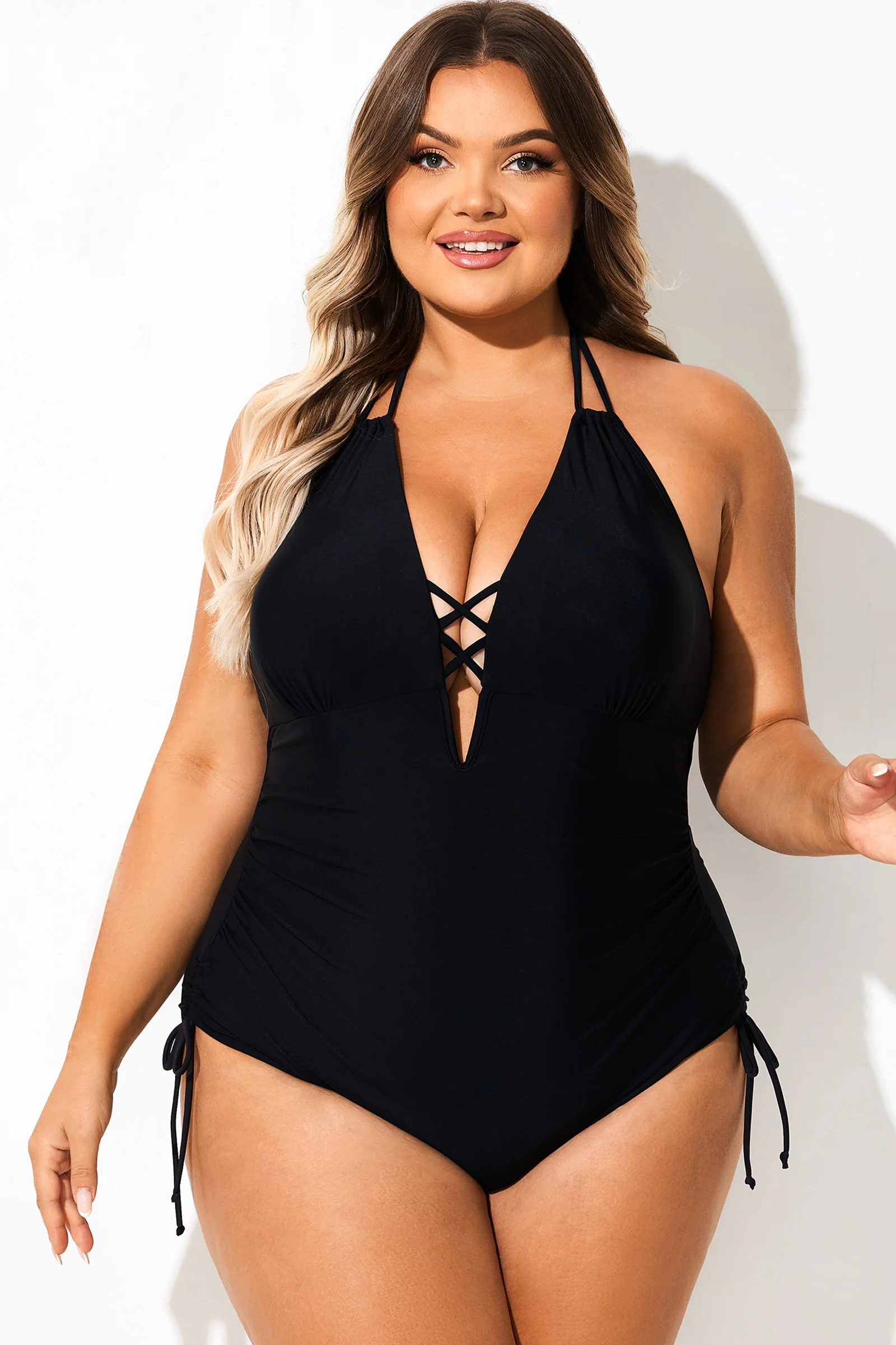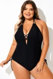 Plus Size Solid Black Halter One Piece Swimsuit - PremCurve