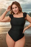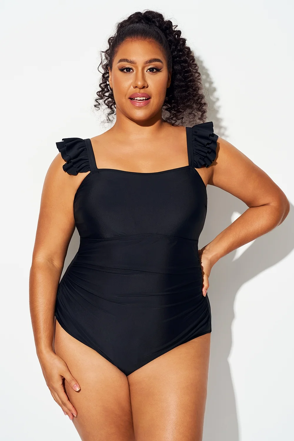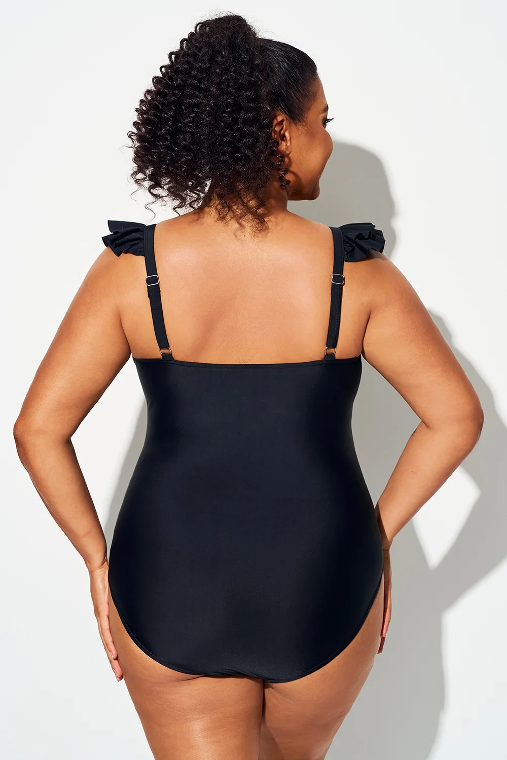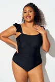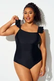 Plus Size Solid Black Ruffles One Piece Swimsuit - PremCurve
