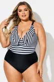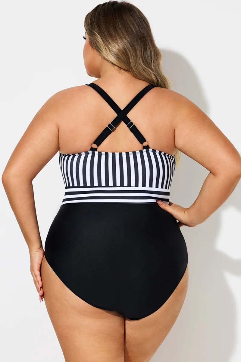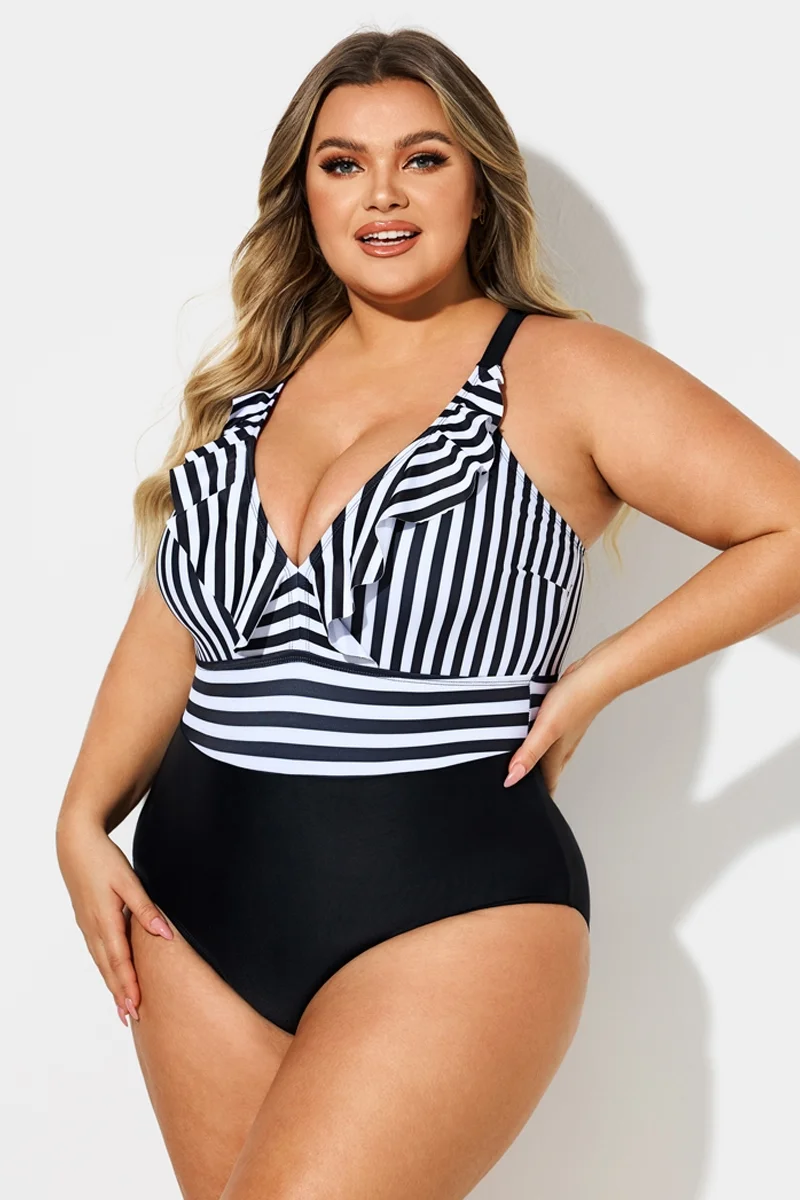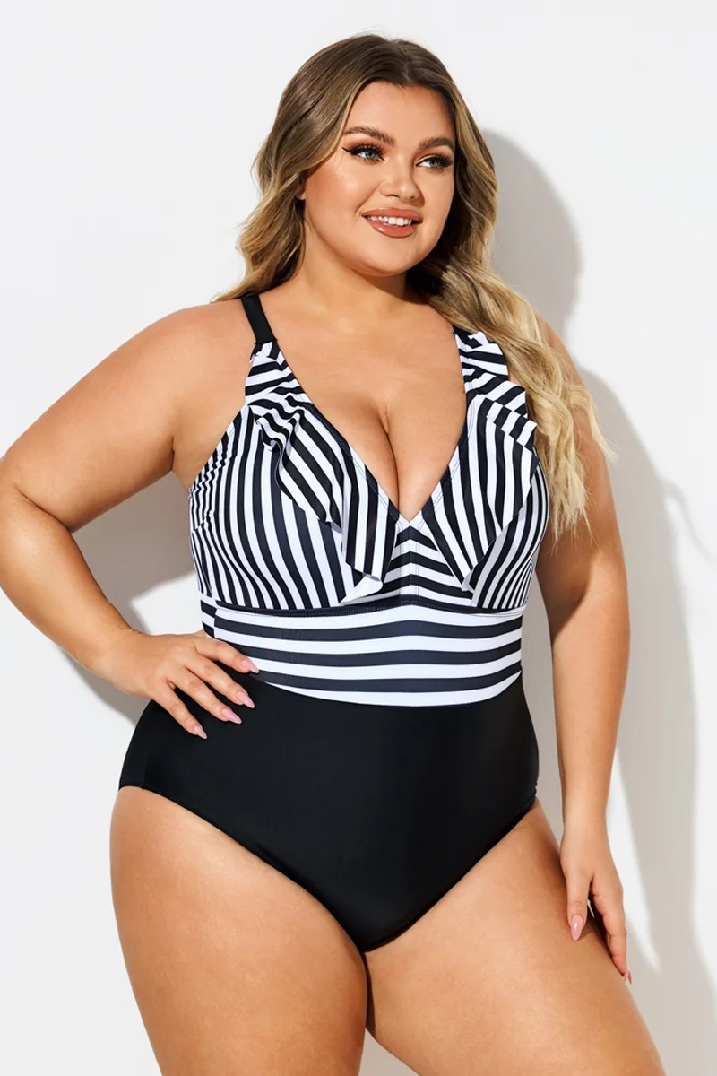 Plus Size Stripe Ruffle Trim V-Neck One Piece Swimsuit - PremCurve