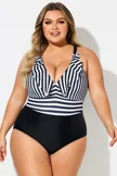 Plus Size Stripe Ruffle Trim V-Neck One Piece Swimsuit