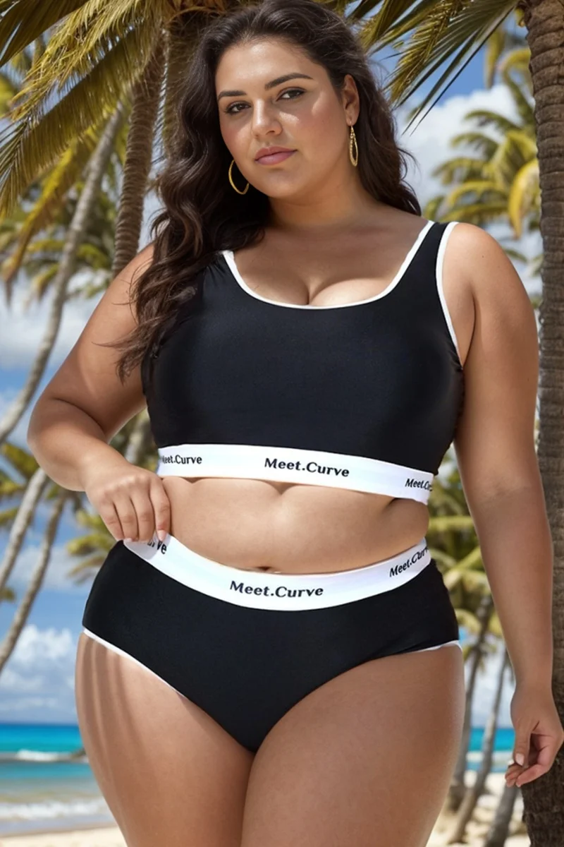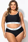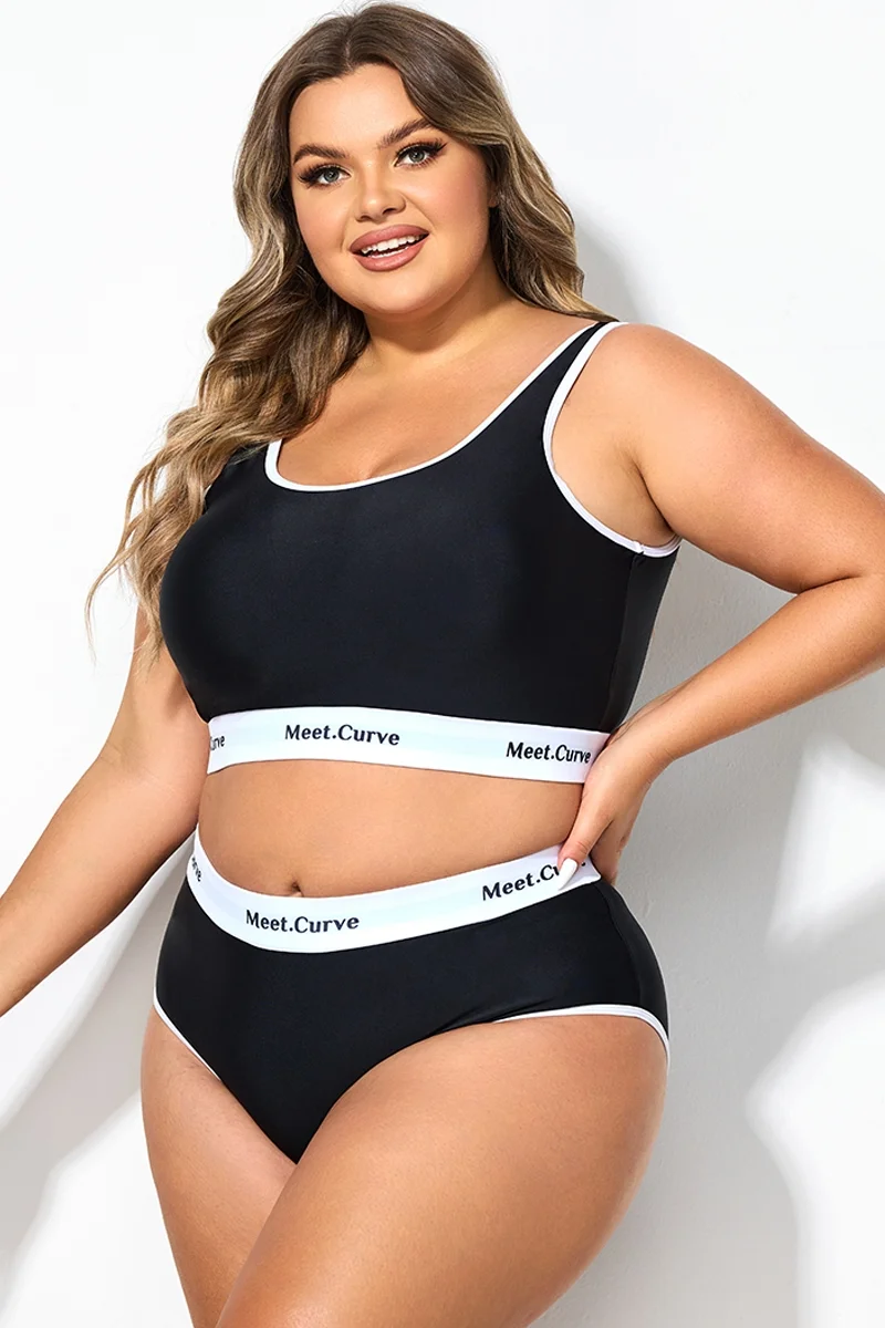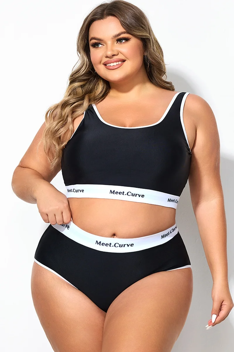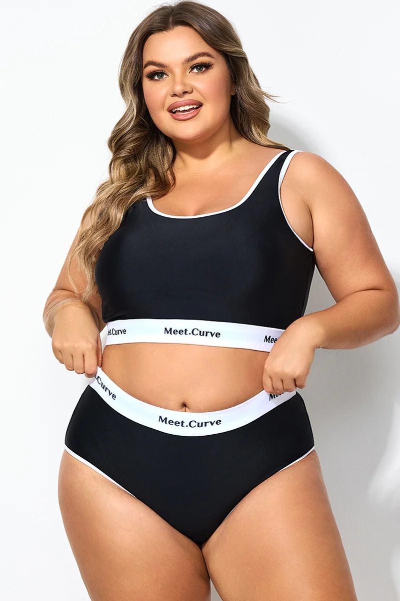 Plus Size Round Neck Black Patchwork Bikini Top