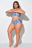 Plus Size Round Neck Black Patchwork Bikini Top