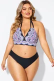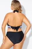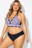 Plus Size Round Neck Black Patchwork Bikini Top