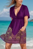 Purple Elastic Waistband V-Neck Cover Up Dress