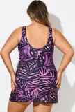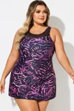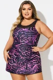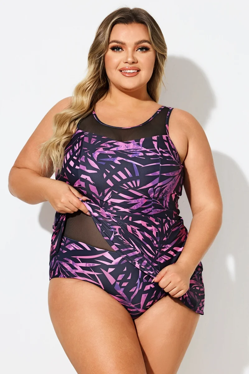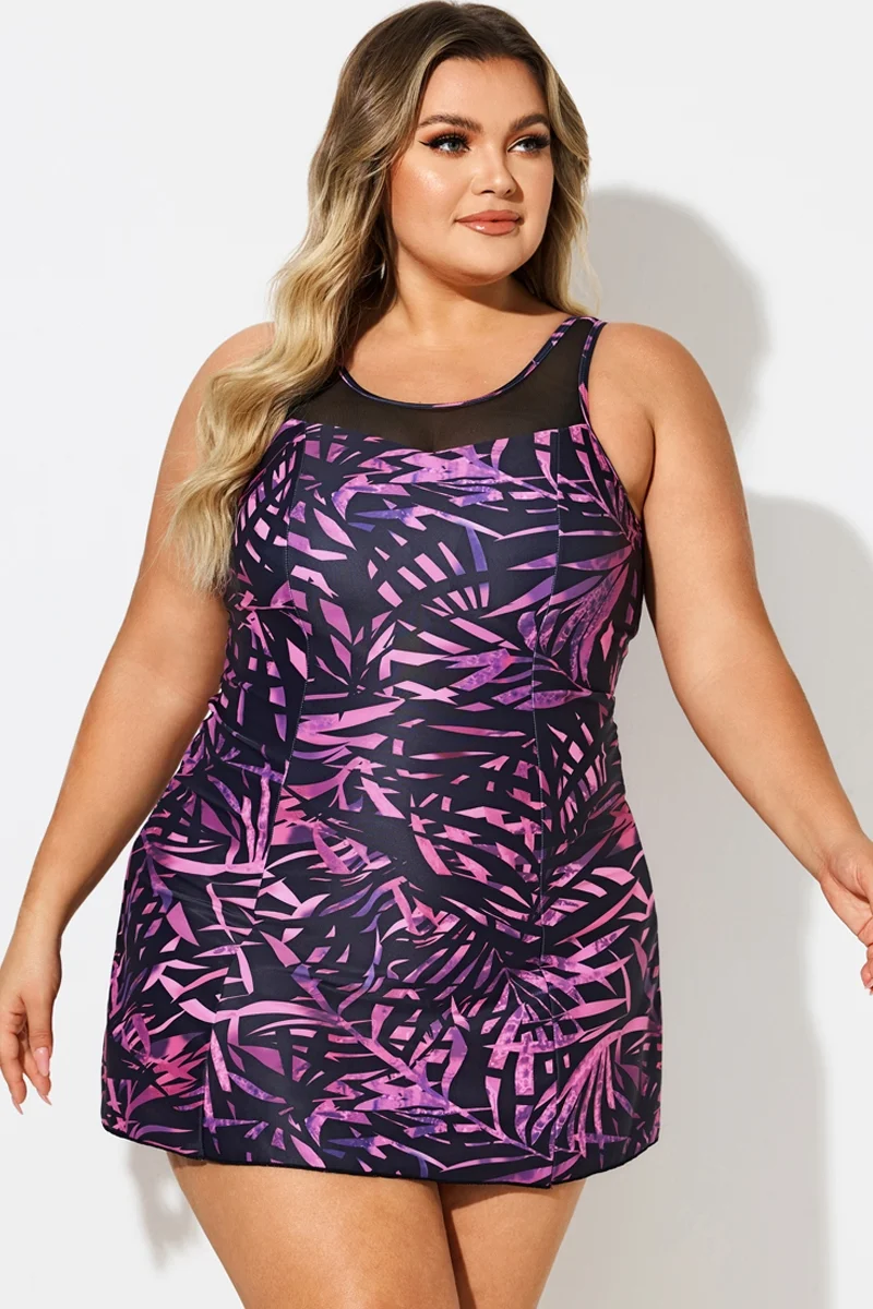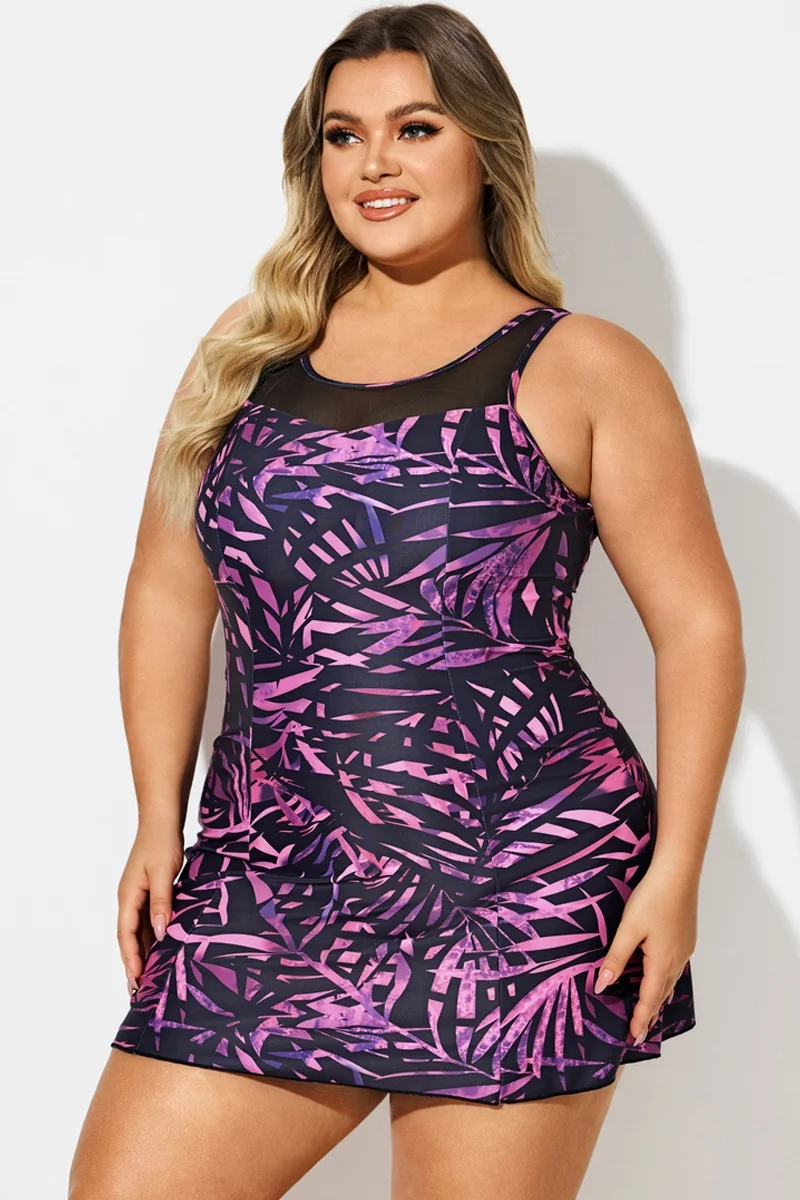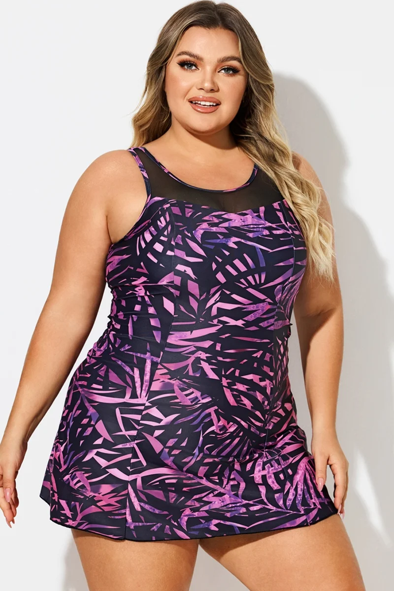 Purple Painterly Leaves Mesh High Neck Swimdress - PremCurve