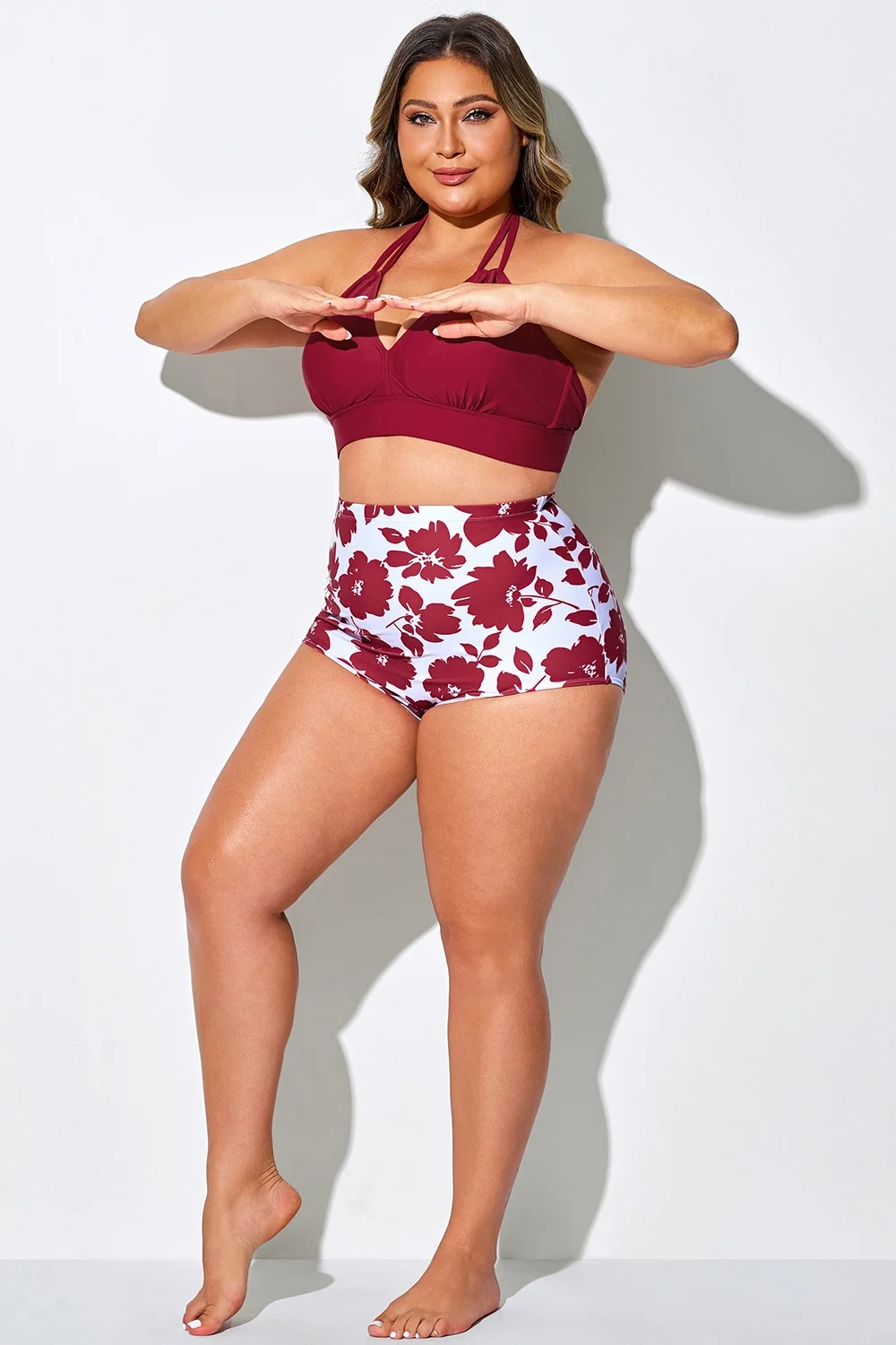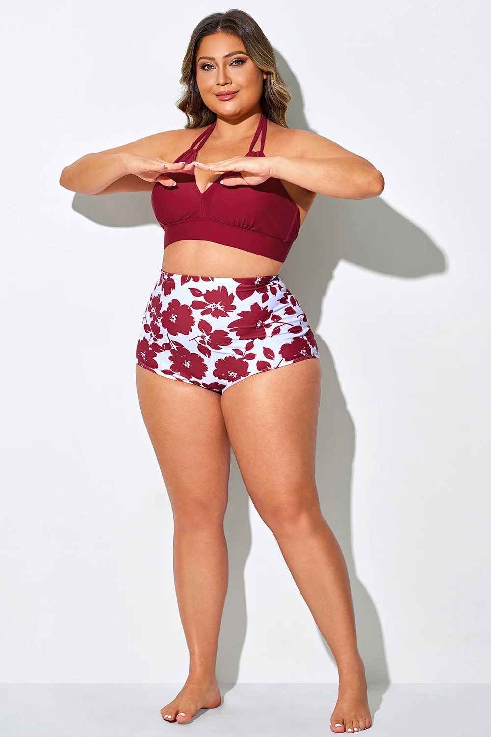 Plus Size Round Neck Black Patchwork Bikini Top