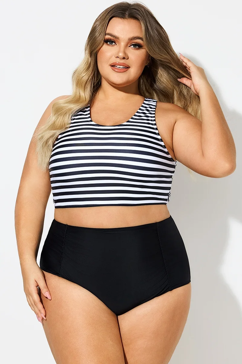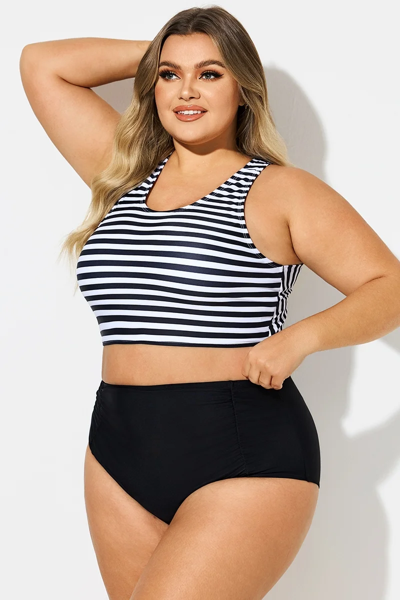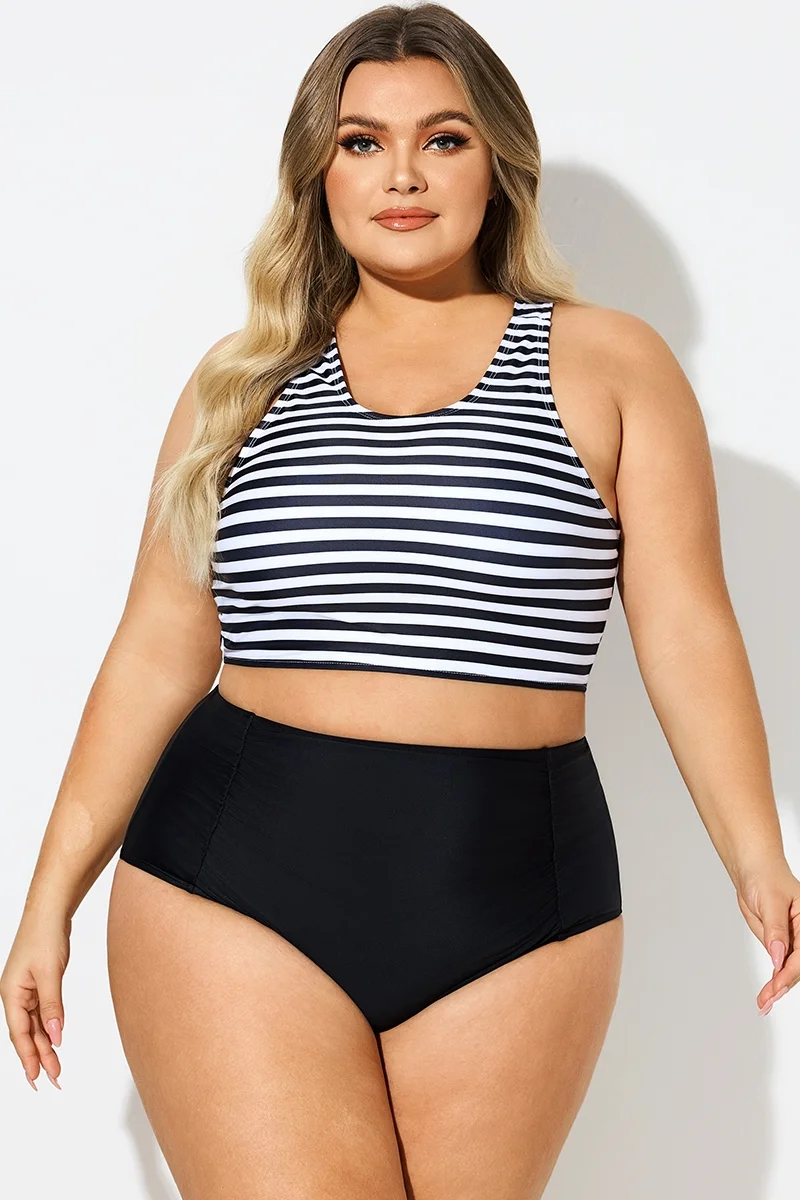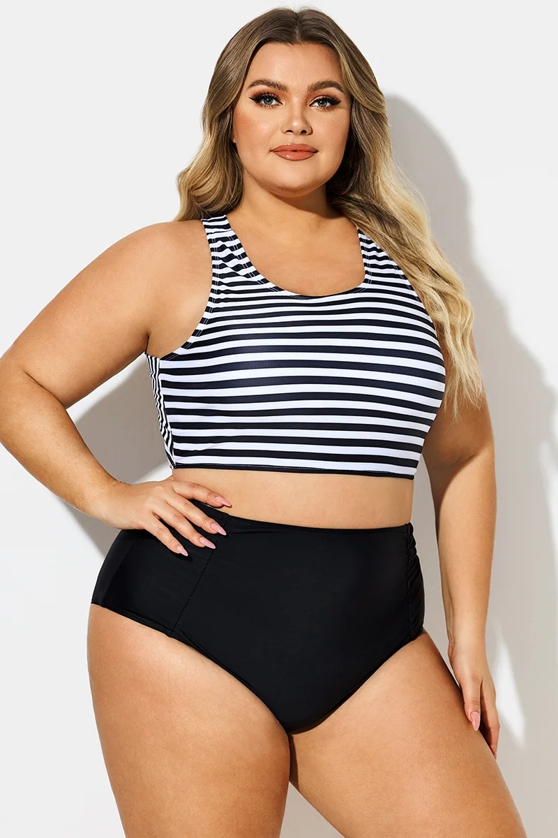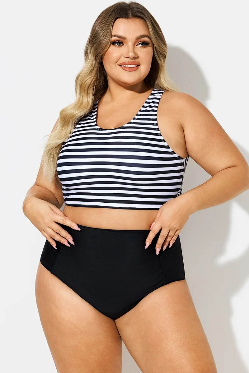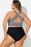 Round Neck Black & White Striped Criss Cross Bikini Top - PremCurve