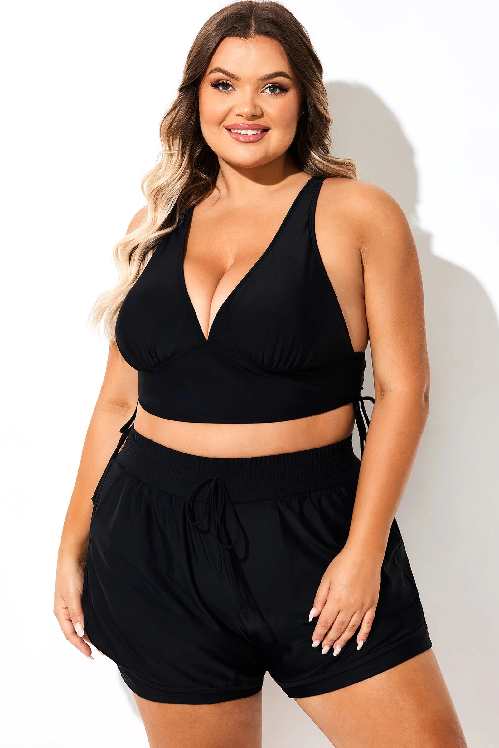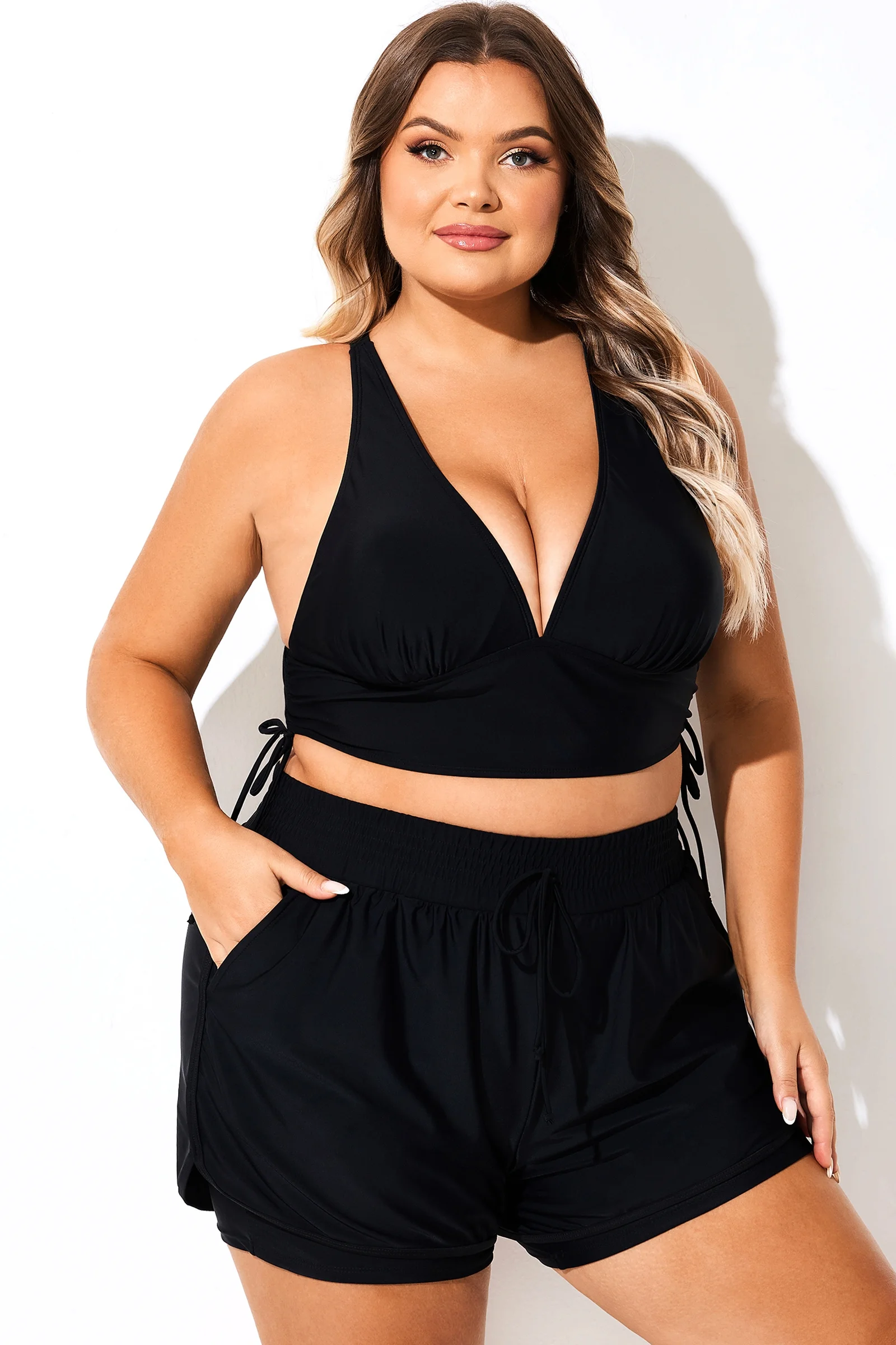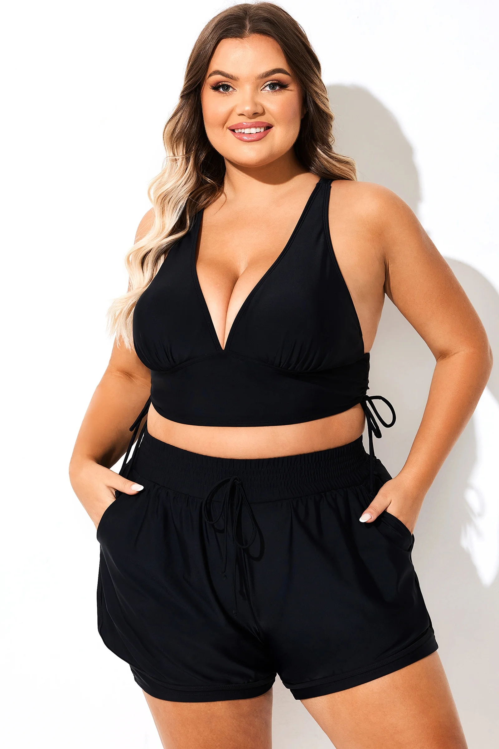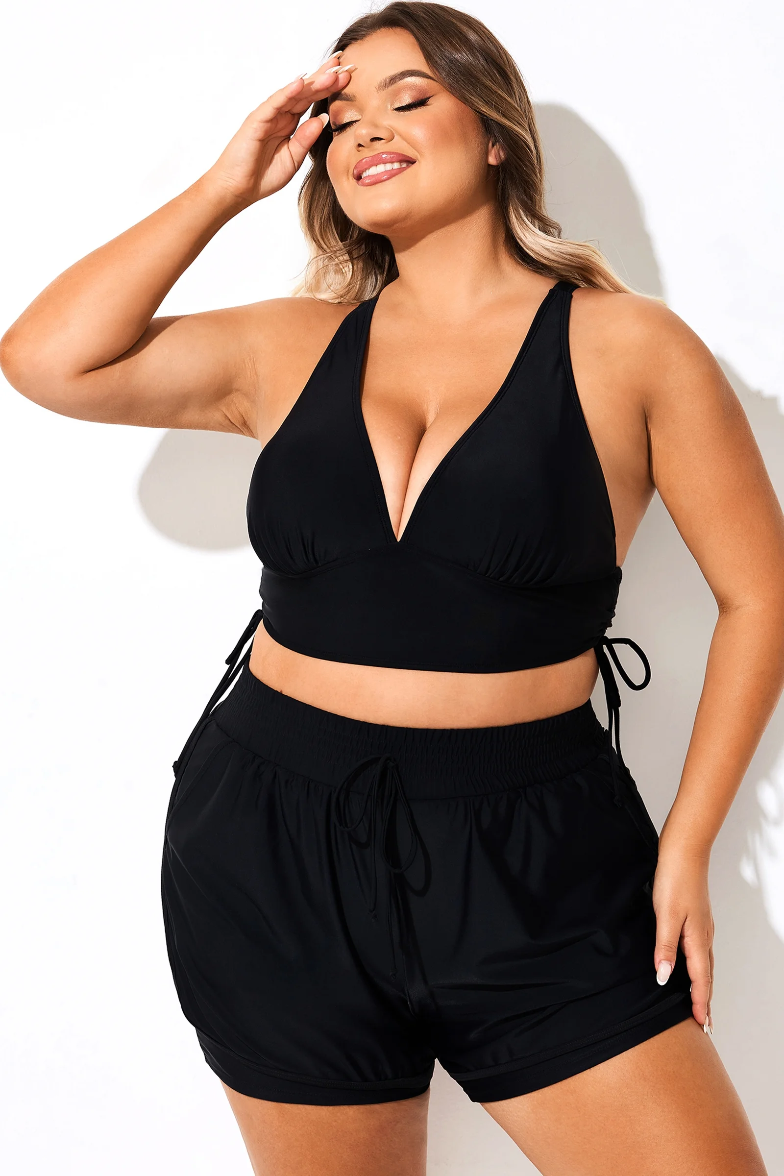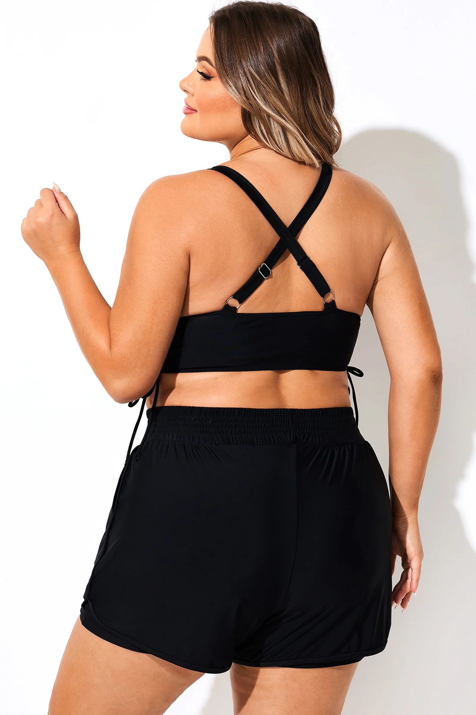 Solid Black Drawstring Ruched Crossback Bikini Top - PremCurve