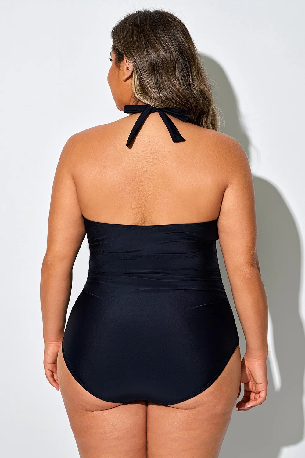Solid Black Hollow Out Halter One Piece Swimsuit - PremCurve