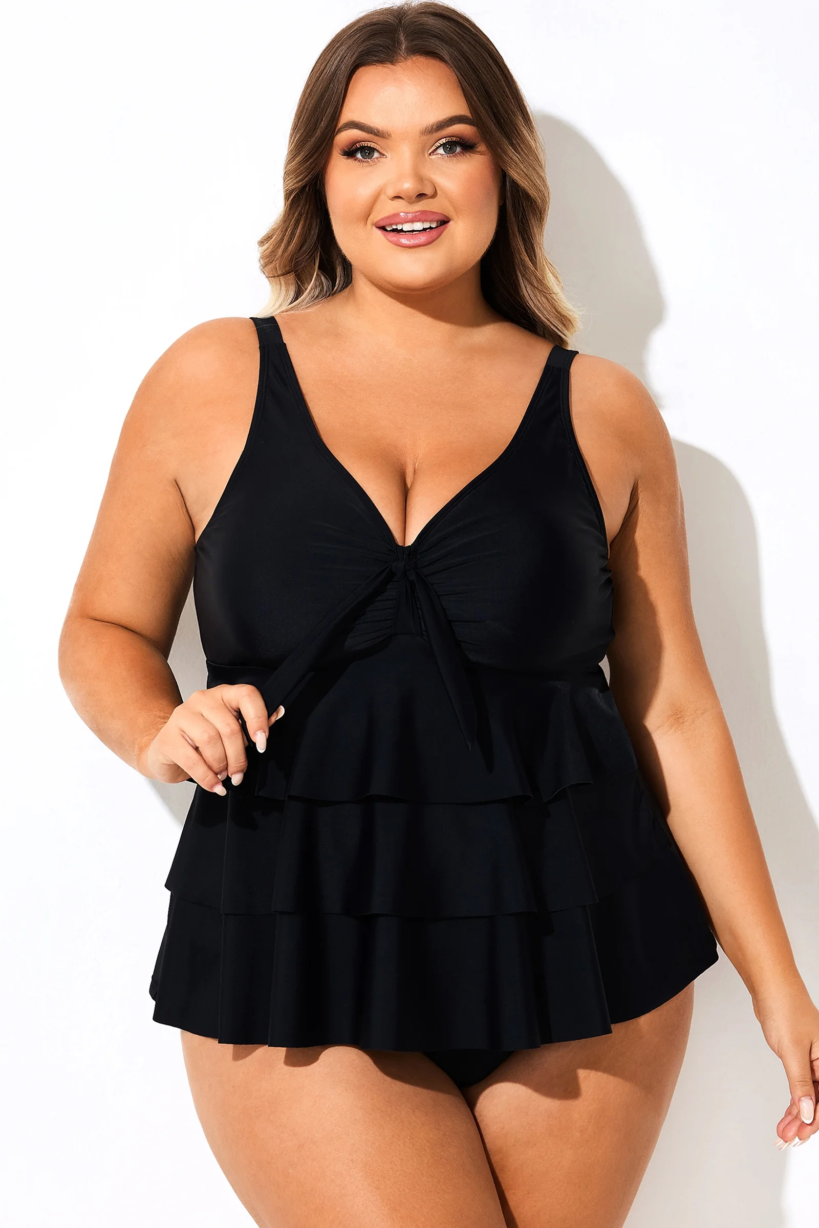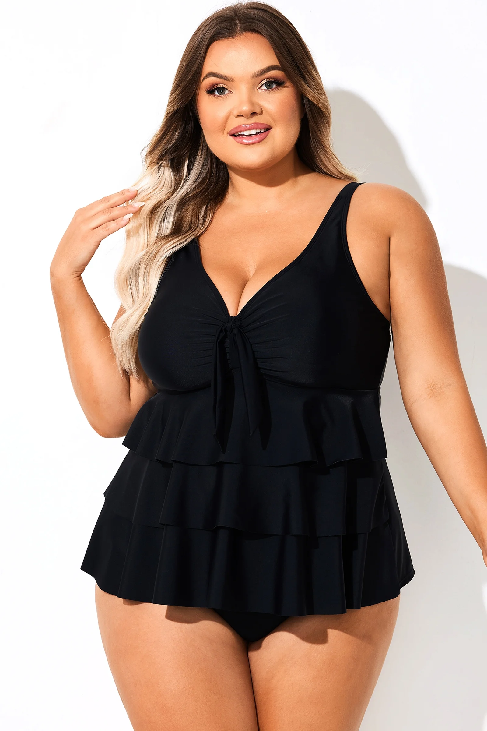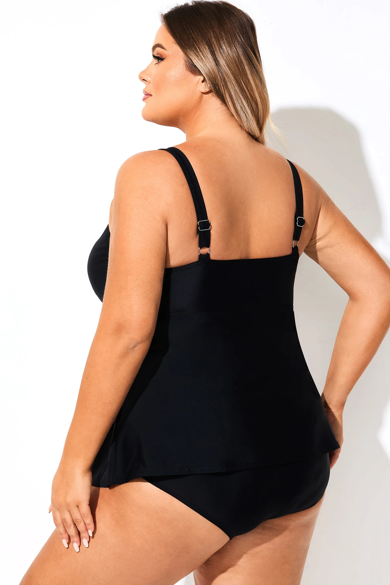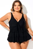 Solid Black V-Neck Ruffled Tankini Top