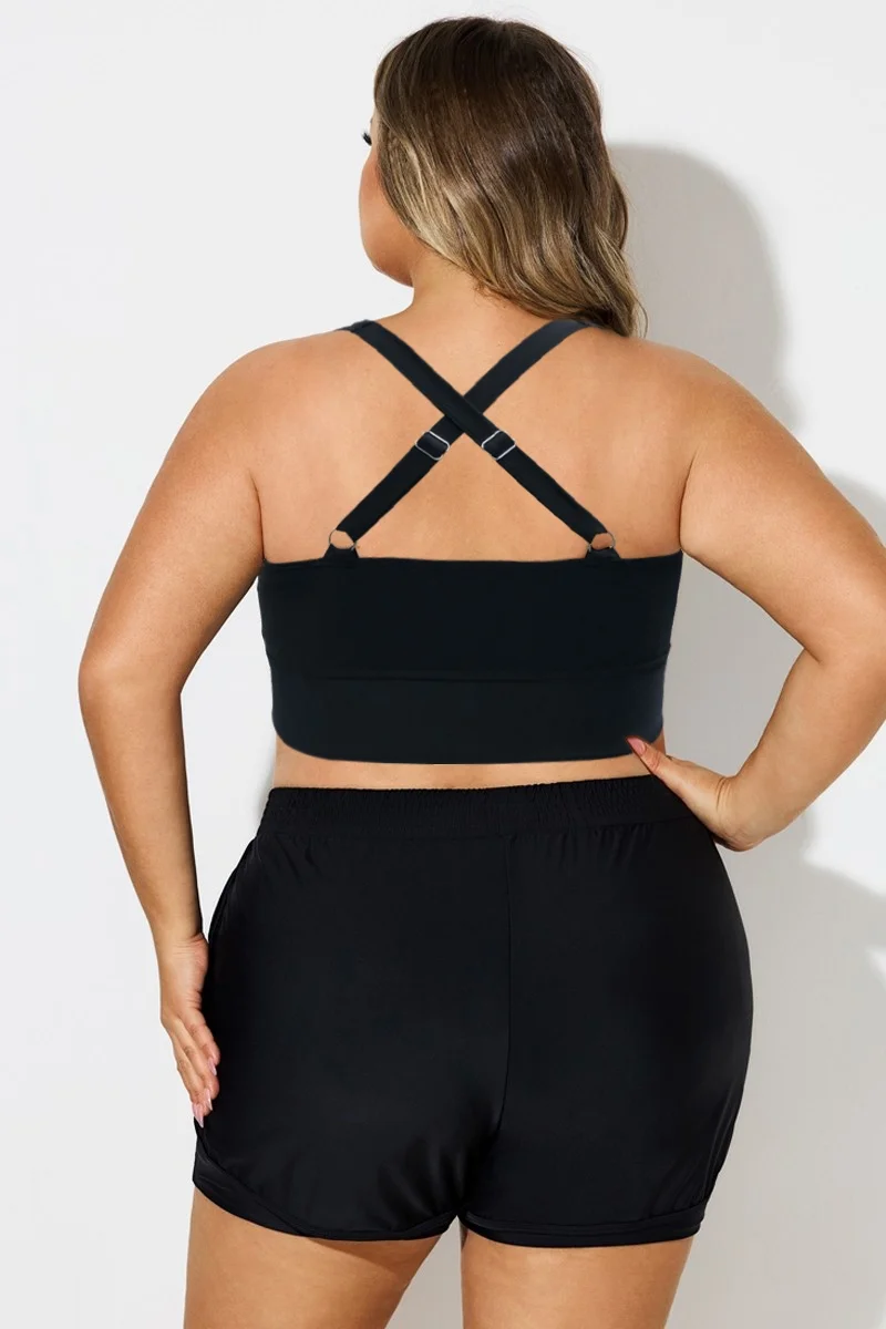 Plus Size Round Neck Black Patchwork Bikini Top