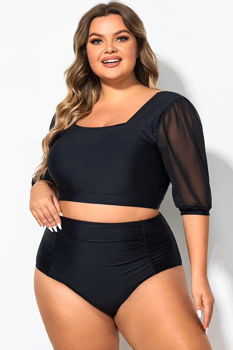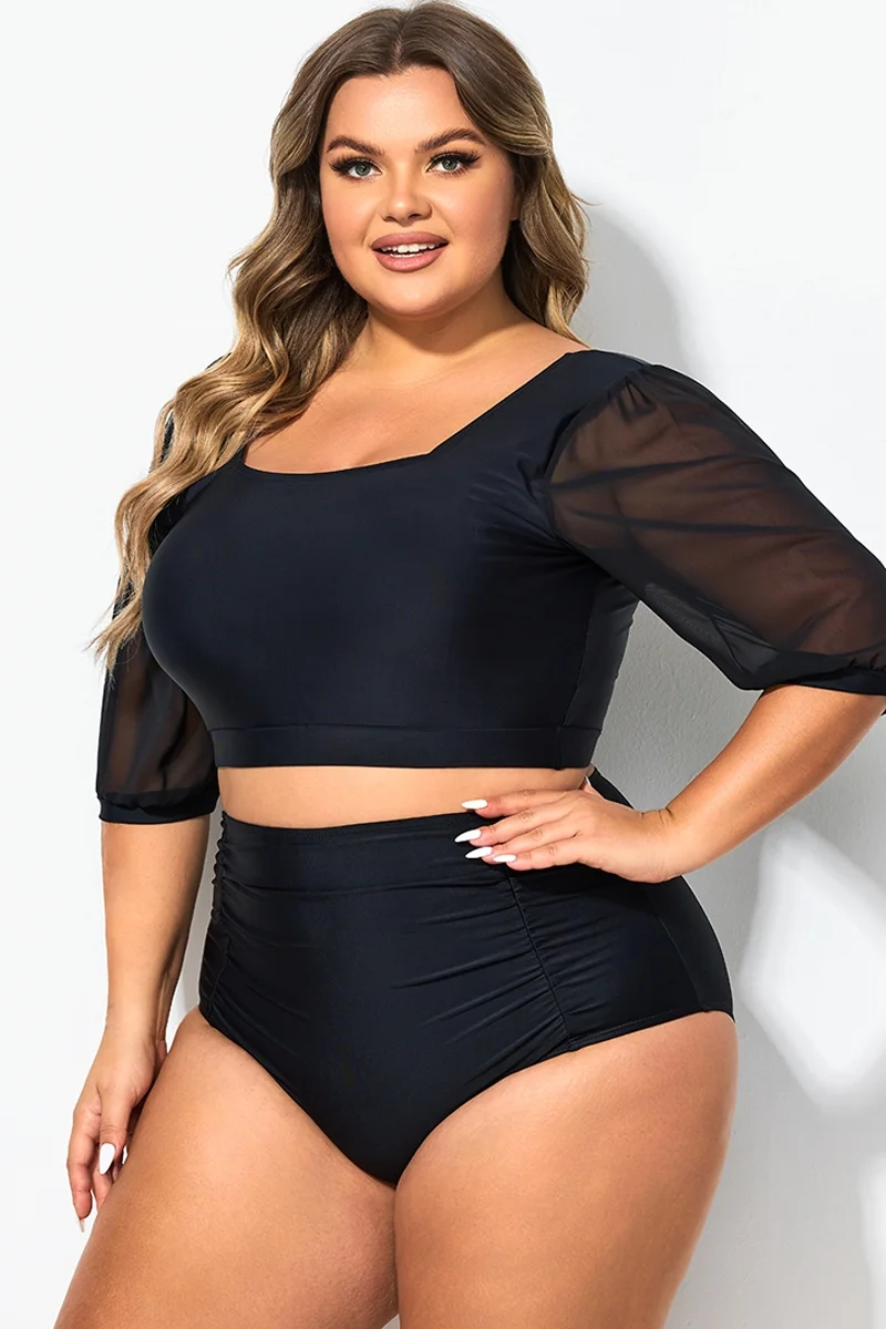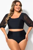 Square Neck Short Mesh Puff Sleeve Bikini Top - PremCurve