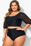 Plus Size Round Neck Black Patchwork Bikini Top