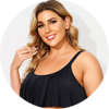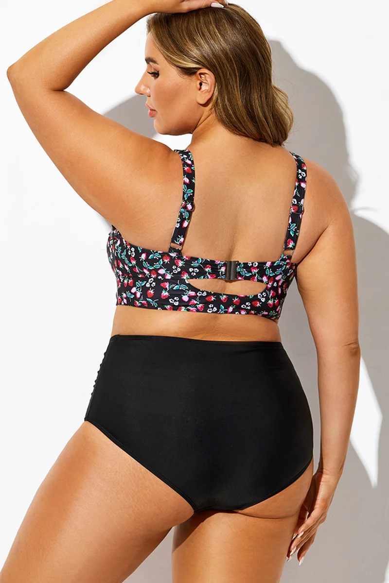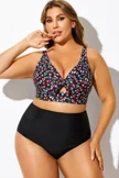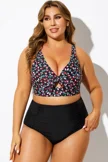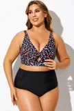 Plus Size Round Neck Black Patchwork Bikini Top
