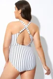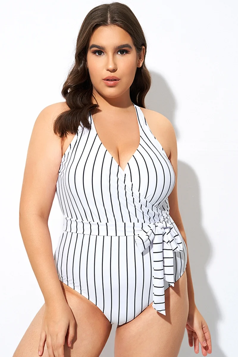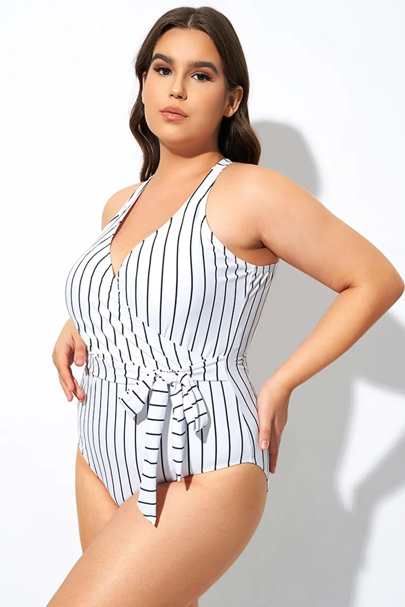 Stripe Print Tie Front Center One Piece Swimsuit - PremCurve