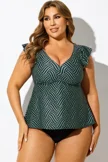 Striped Print Ruffle Trim V-Neck Tankini Top - PremCurve