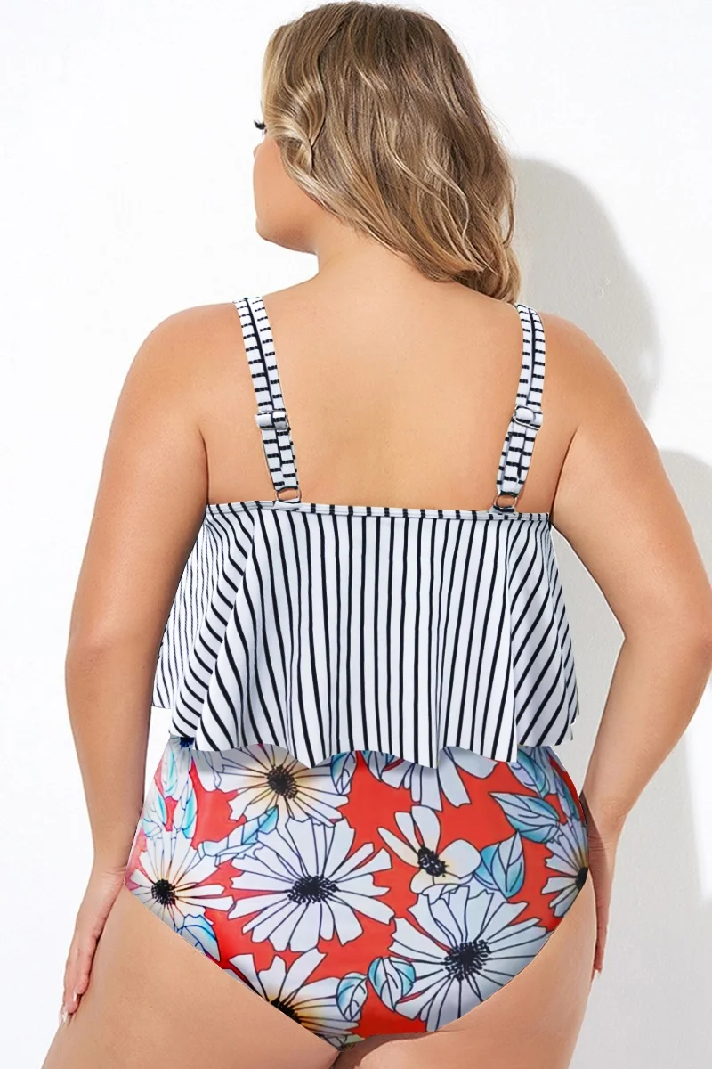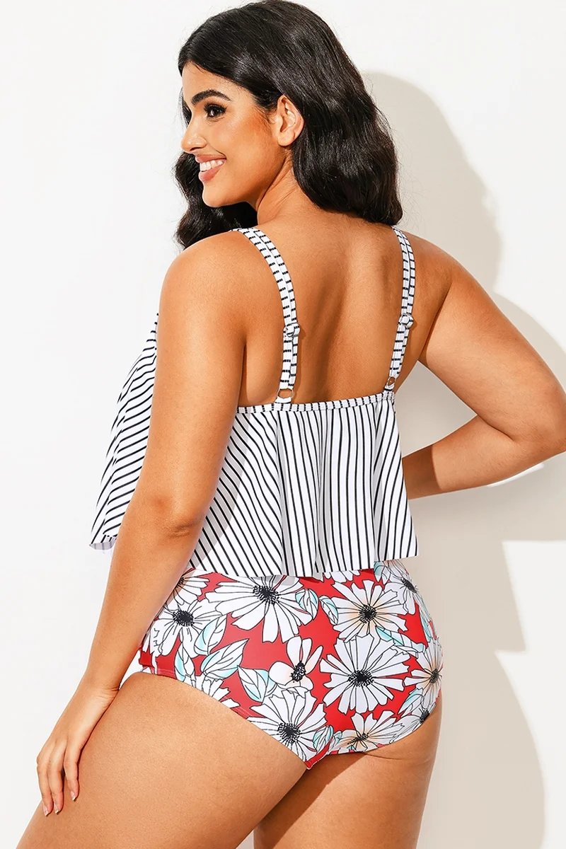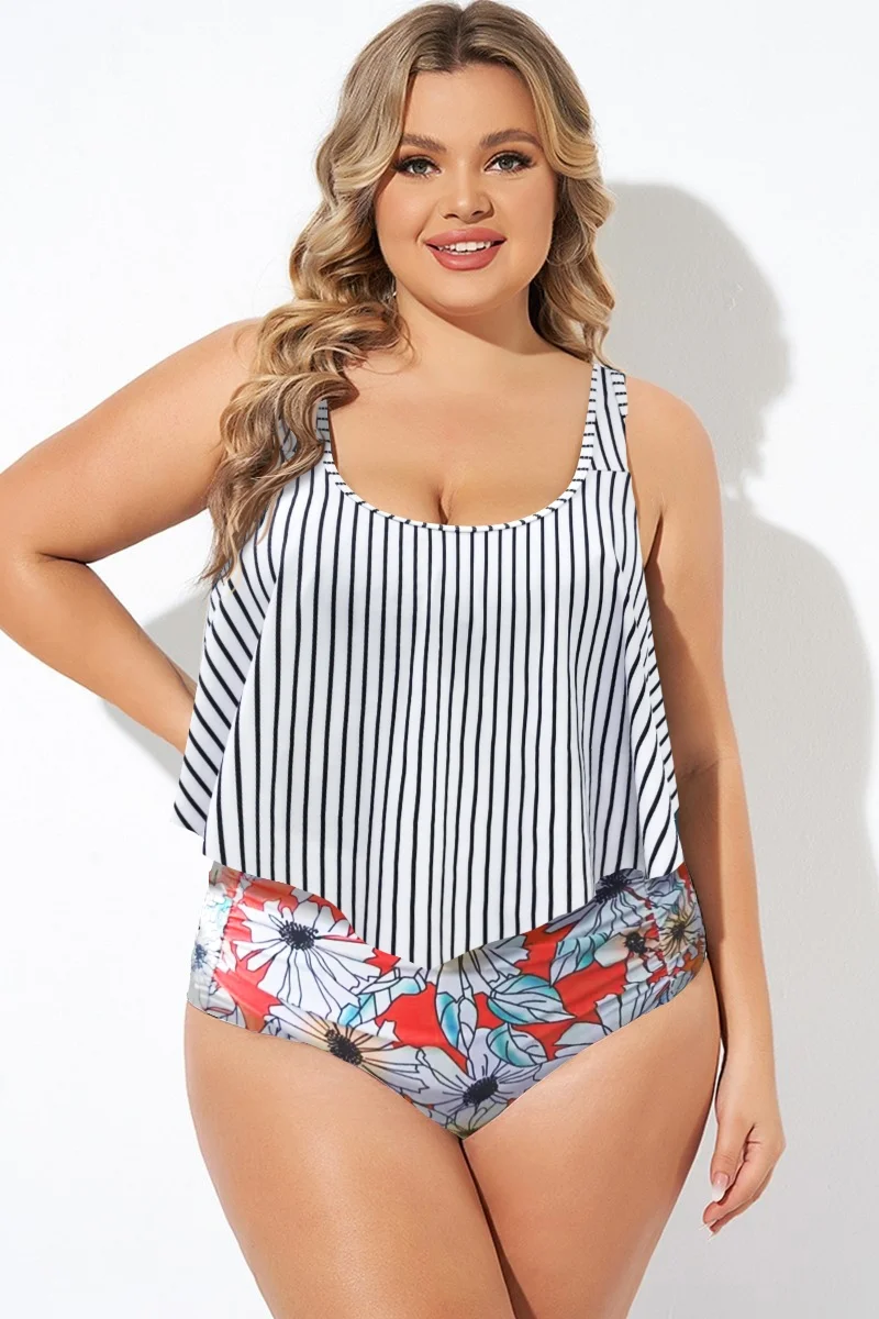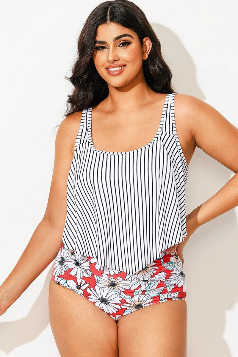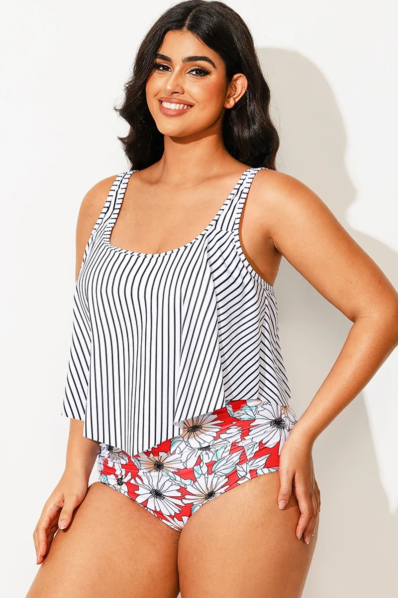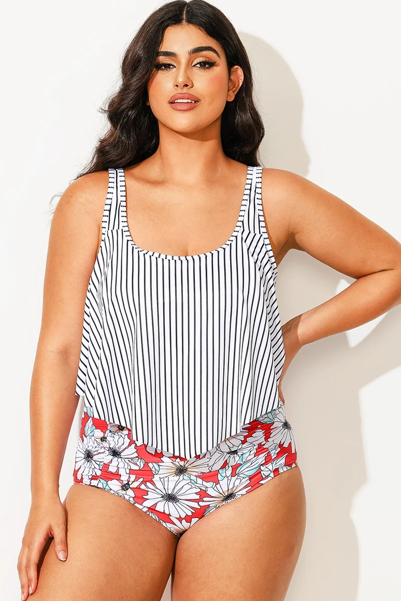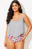 Striped Scoop Neck Ruched Flounce Blouson Tankini Top - PremCurve
