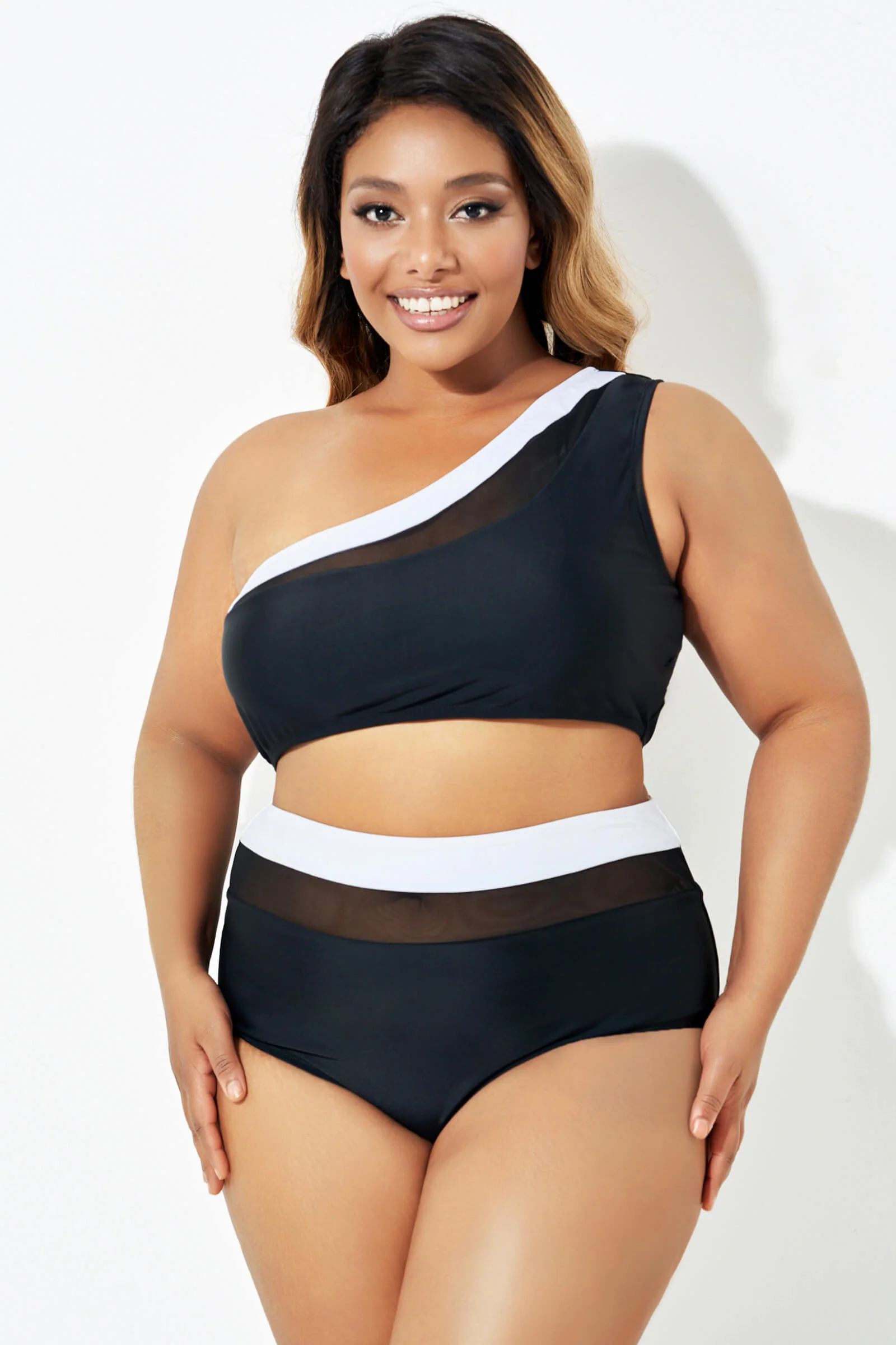 Plus Size Round Neck Black Patchwork Bikini Top