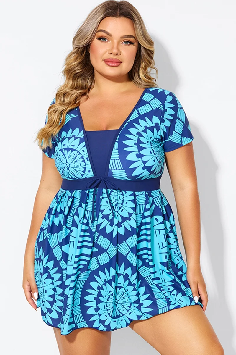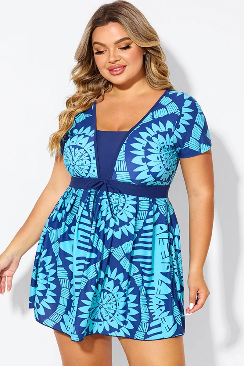 Tribal Print Cyan Short Sleeve Women Swimdress - PremCurve