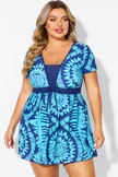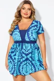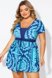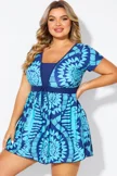 Tribal Print Cyan Short Sleeve Women Swimdress