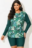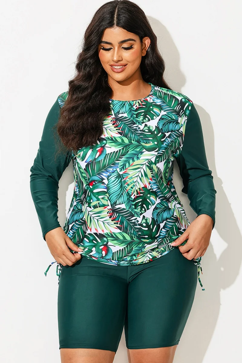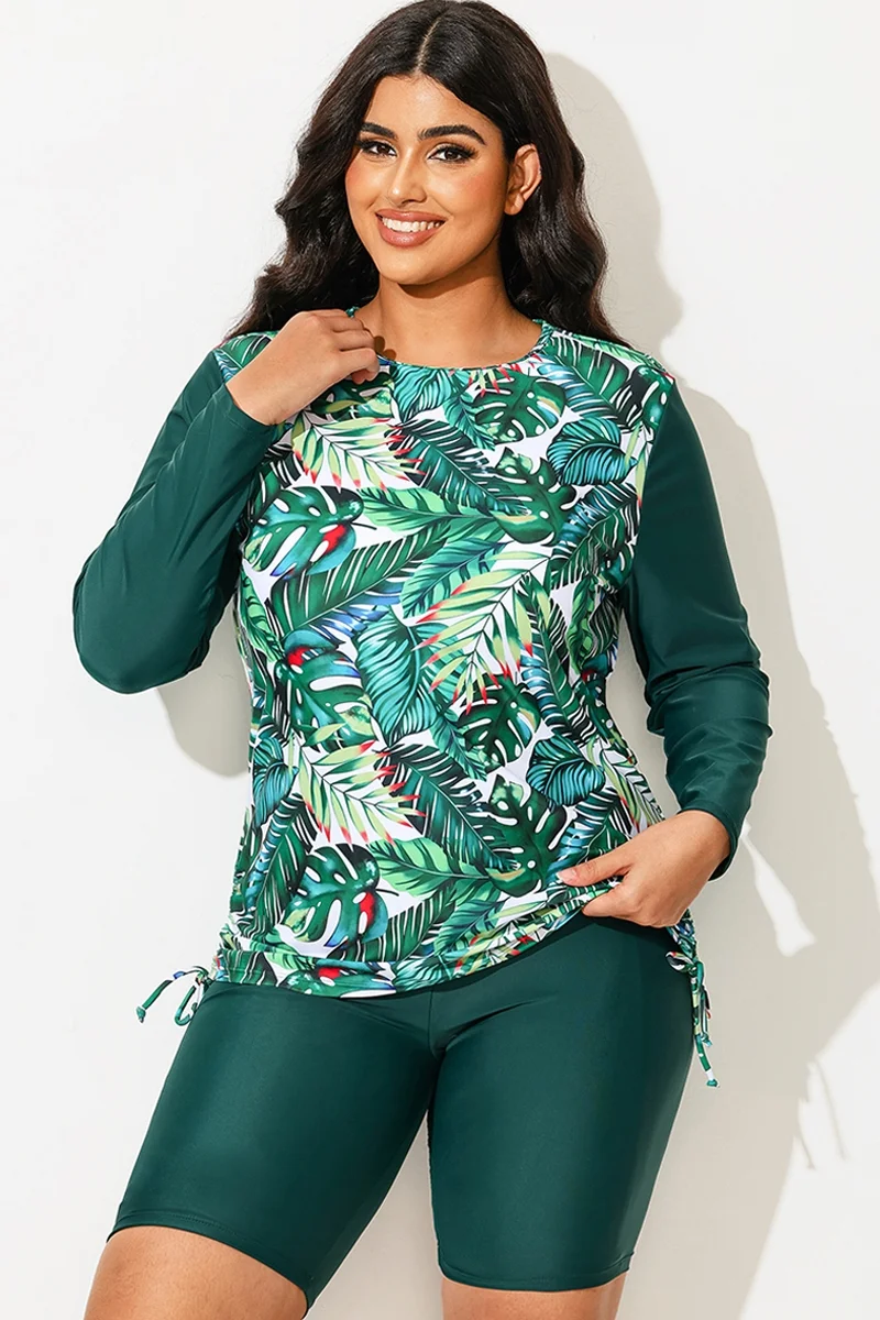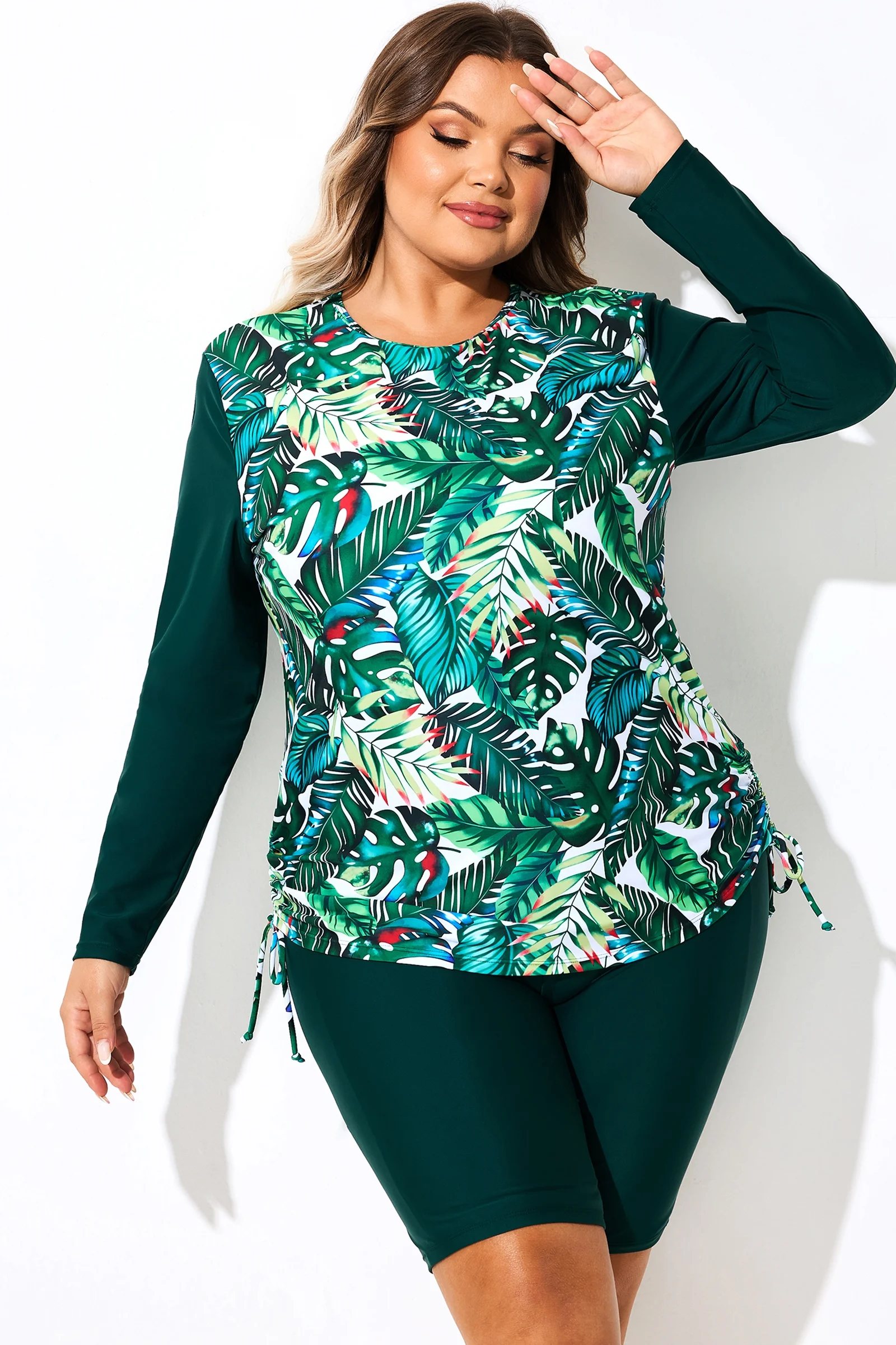 Tropical Print Side Tie Adjustable Long Sleeve Tankini Top