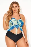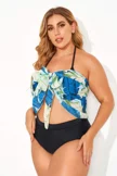 Plus Size Round Neck Black Patchwork Bikini Top