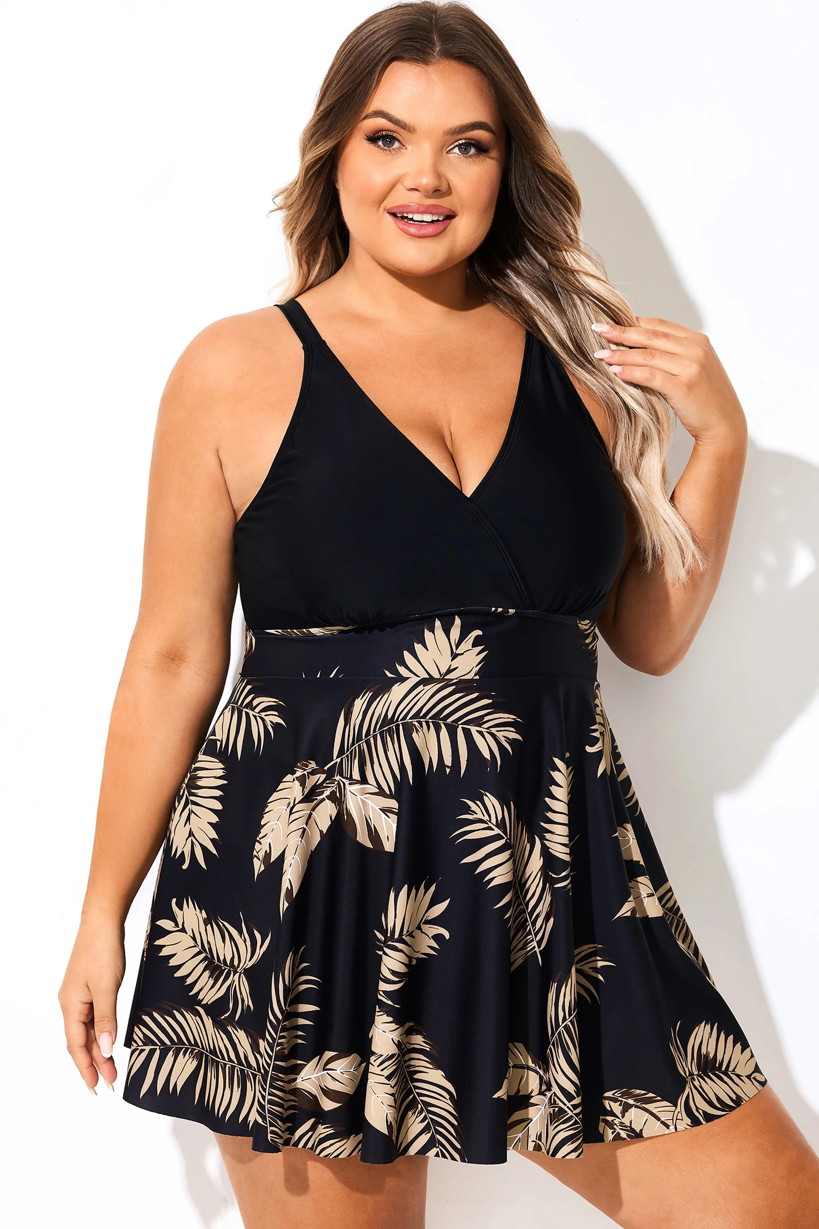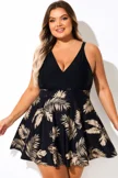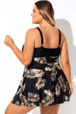 V Neck Black Floral Print Patchwork Swimdress