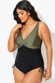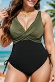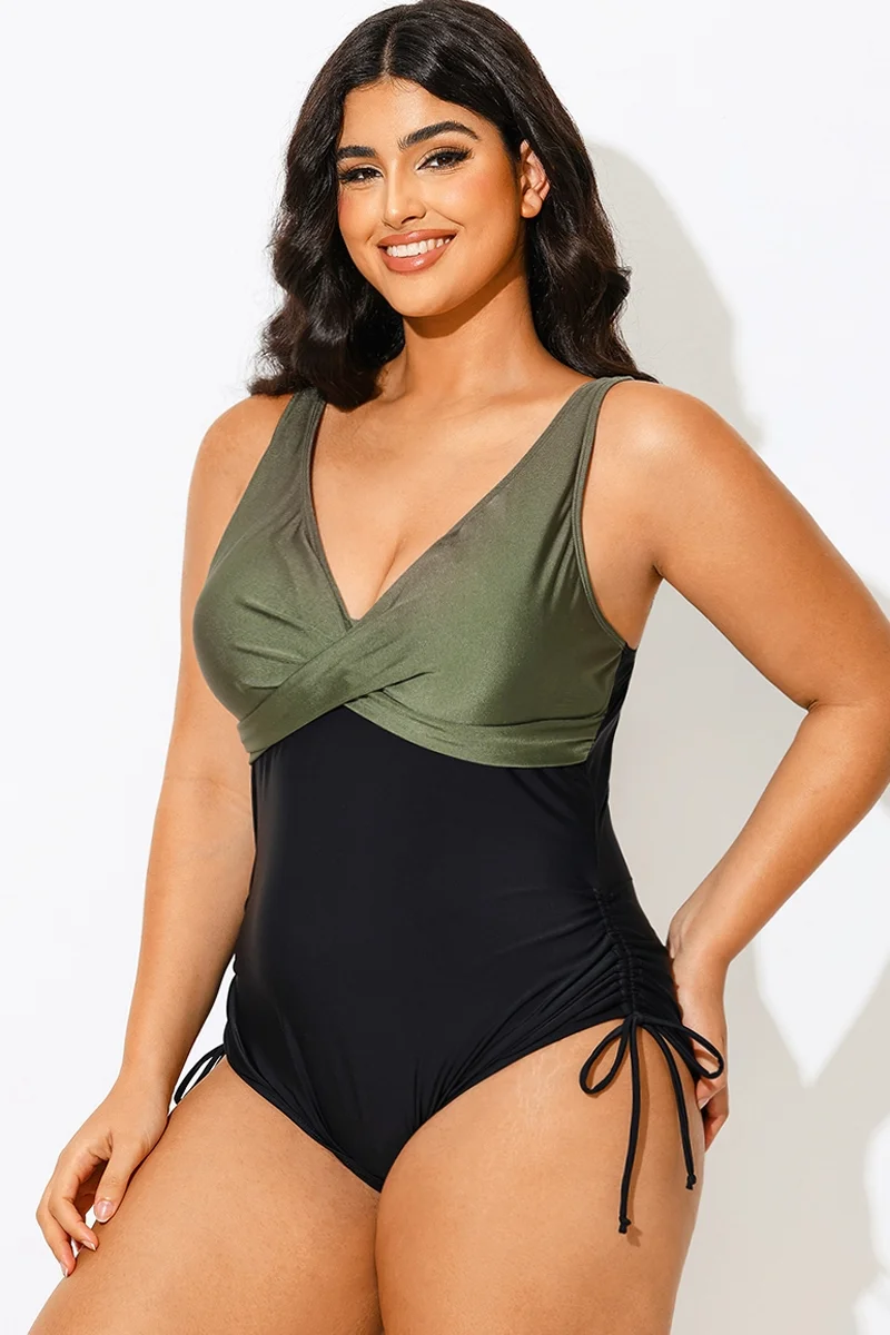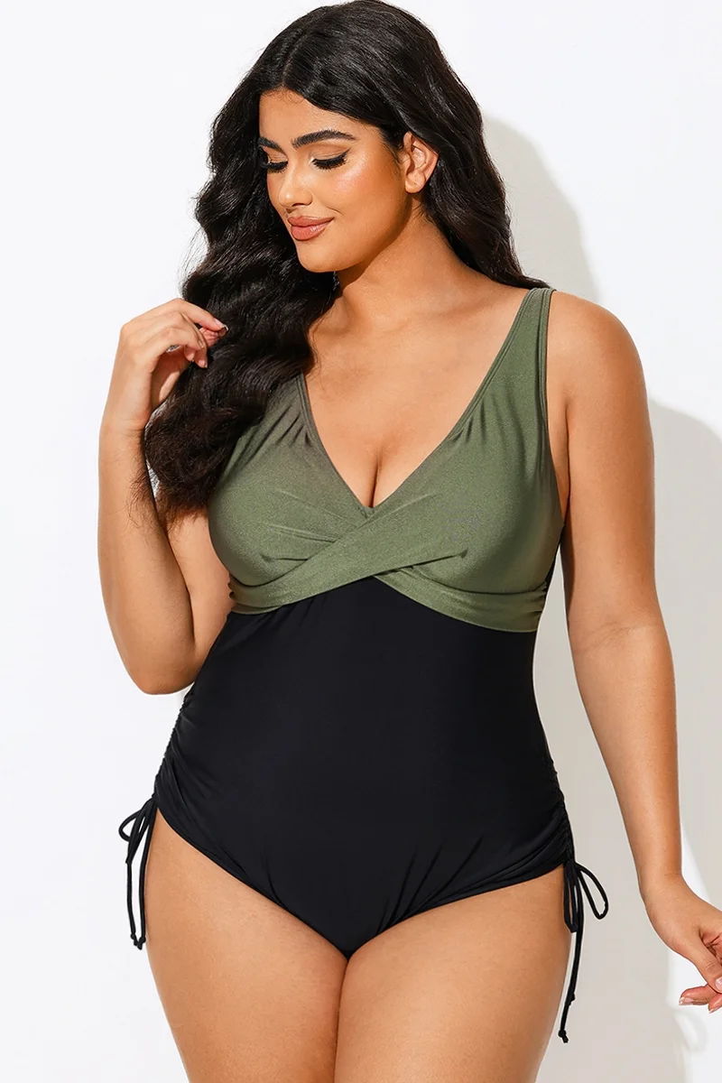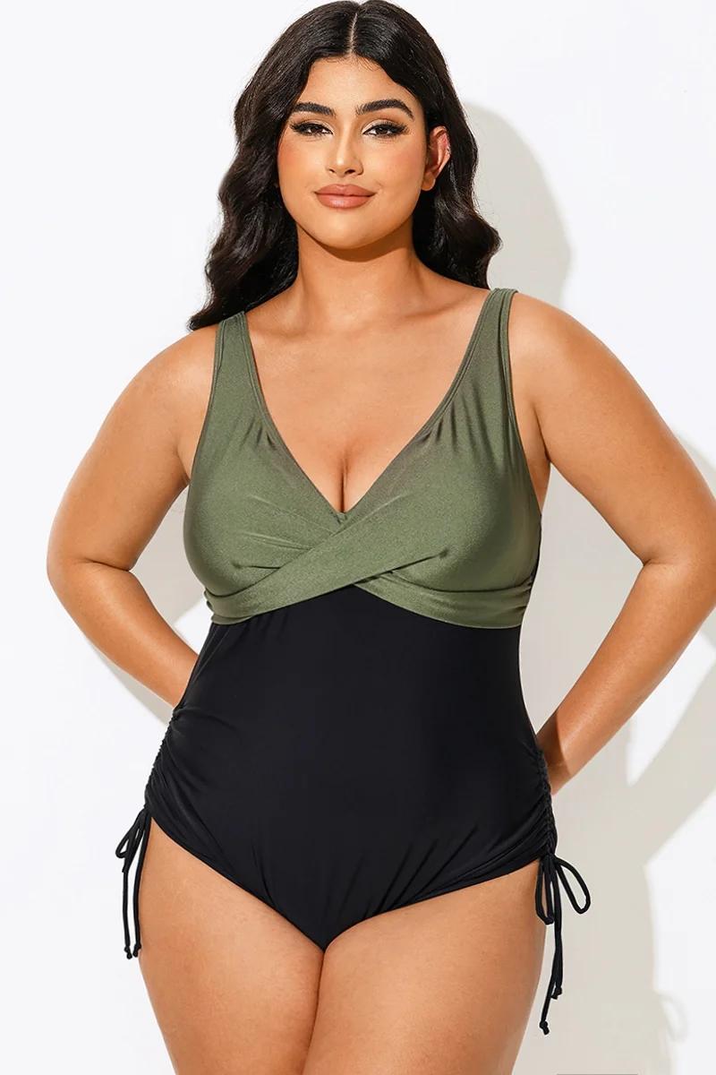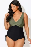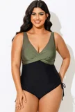 V-Neck Green Colorblock One Piece Swimsuit - PremCurve
