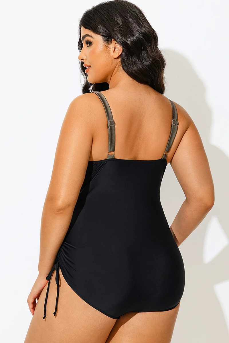 Plus Size Round Neck Black Patchwork Bikini Top