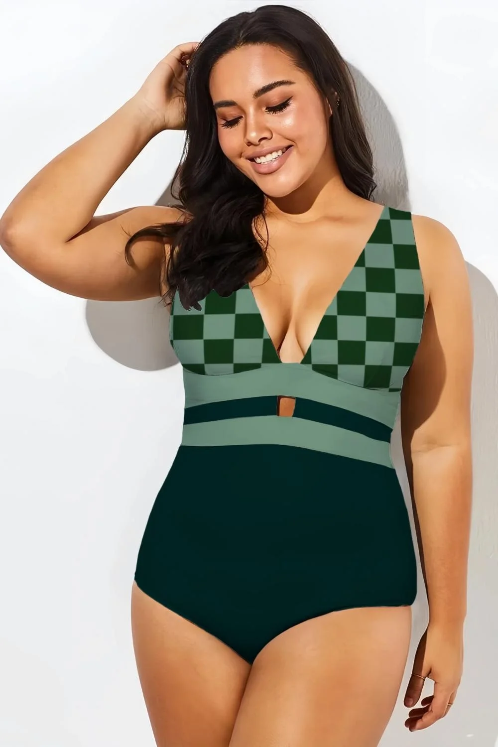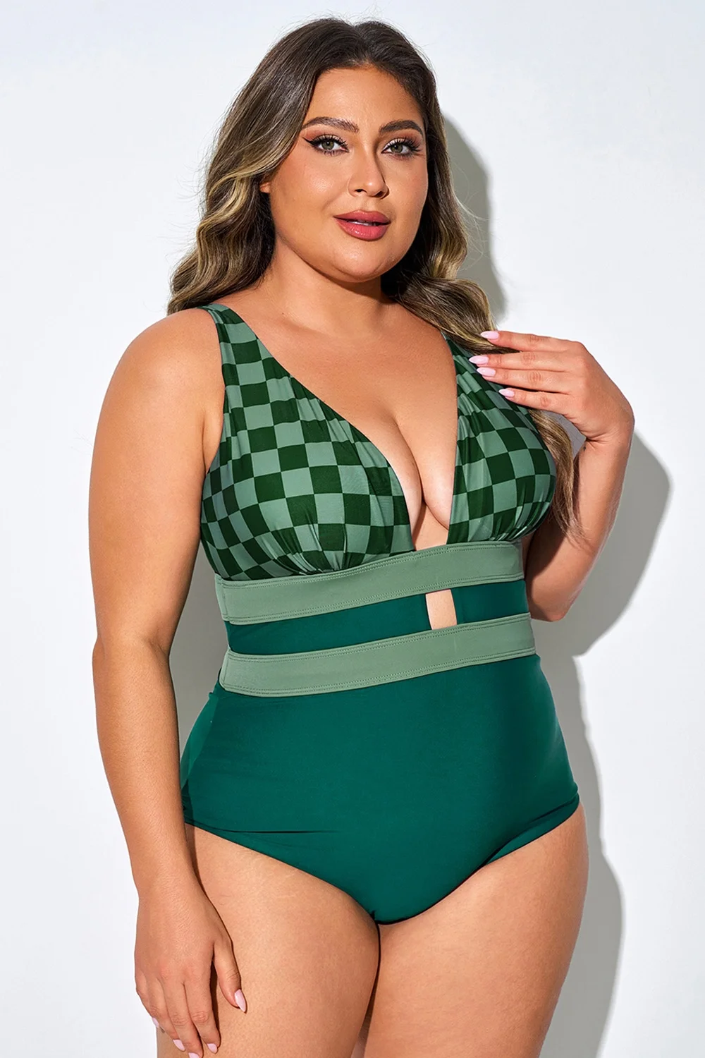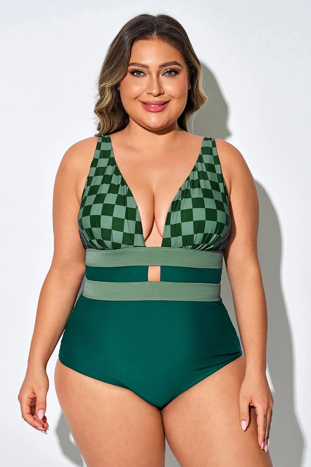 V-Neck Green Squares Cut Out One Piece Swimsuit - PremCurve