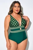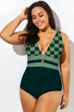 V-Neck Green Squares Cut Out One Piece Swimsuit