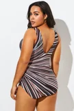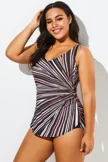 I have this style in two different colors. I can't stress how flattering it is. It's great if you have a belly! I'm 5'4" 218 lbs and a 2x was perfect! If you have trouble finding a suit that fits well and helps camouflage a tummy, this is your suit!Laura3 -