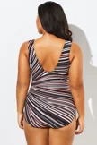 I just received this swimsuit and tried it on right away, it fits perfectly, I'm in love with it. The front is very flattering.FamDoc2 -