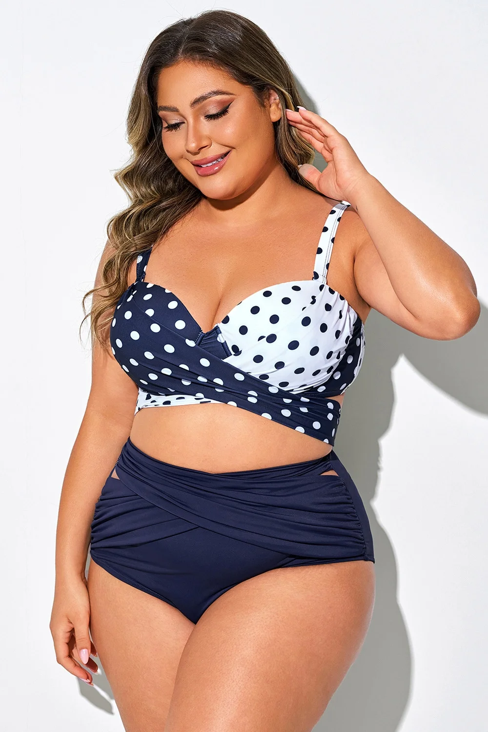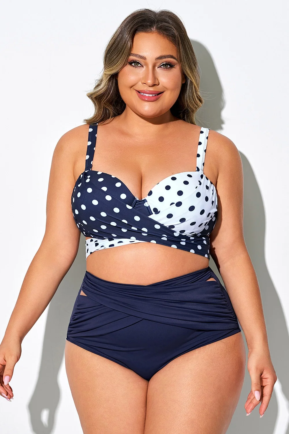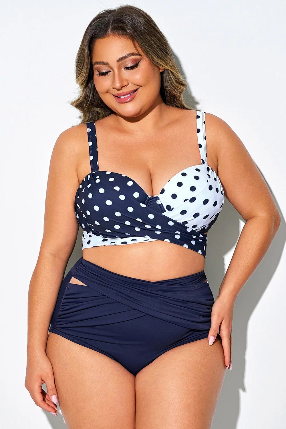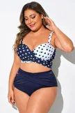Plus Size Round Neck Black Patchwork Bikini Top