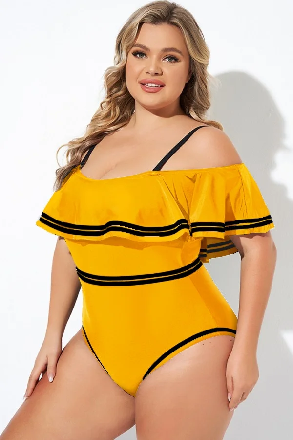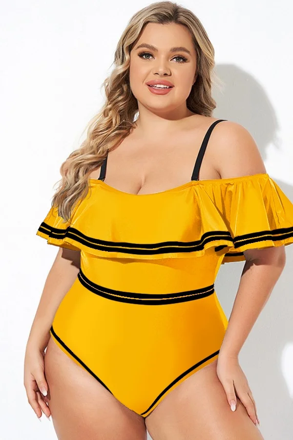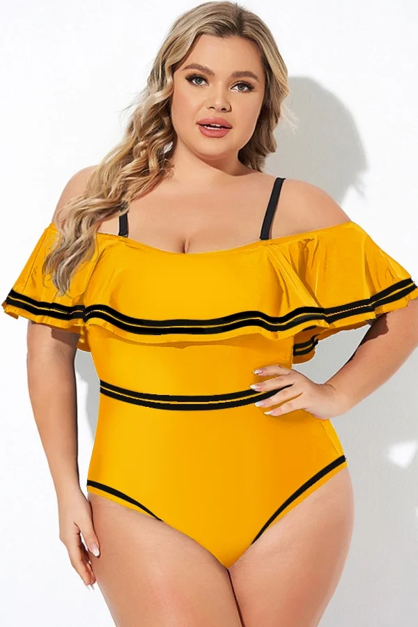 Yellow Off Shoulder Ruffles One Piece Swimsuit - PremCurve